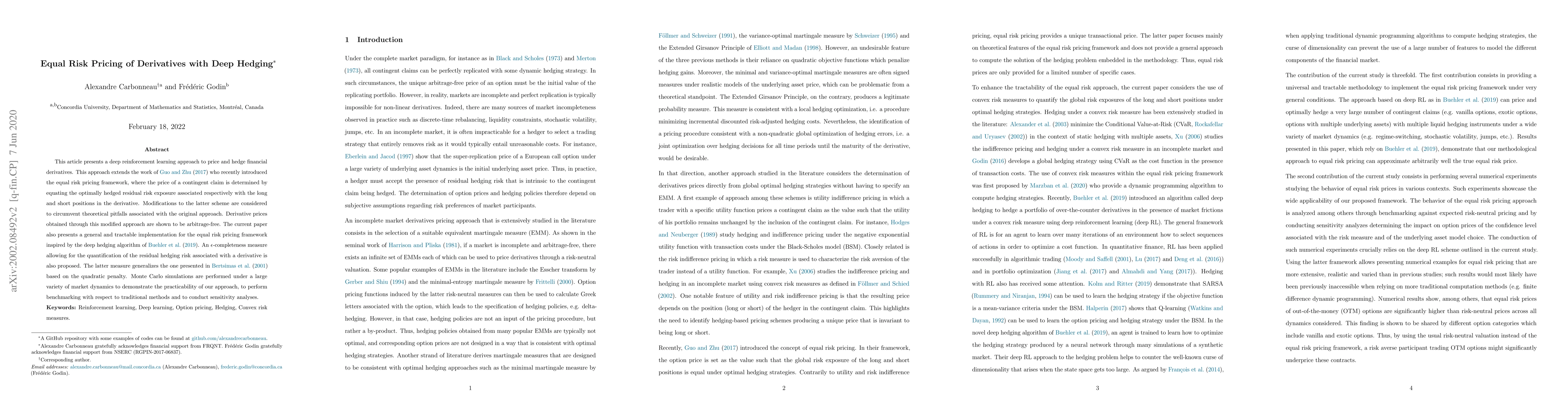 This article presents a deep reinforcement learning approach to price and hedge financial derivatives. This approach extends the work of Guo and Zhu (2017) who recently introduced the equal risk pricing framework, where the price of a contingent claim is determined by equating the optimally hedged residual risk exposure associated respectively with the long and short positions in the derivative. Modifications to the latter scheme are considered to circumvent theoretical pitfalls associated with the original approach. Derivative prices obtained through this modified approach are shown to be arbitrage-free. The current paper also presents a general and tractable implementation for the equal risk pricing framework inspired by the deep hedging algorithm of Buehler et al. (2019). An $\epsilon$-completeness measure allowing for the quantification of the residual hedging risk associated with a derivative is also proposed. The latter measure generalizes the one presented in Bertsimas et al. (2001) based on the quadratic penalty. Monte Carlo simulations are performed under a large variety of market dynamics to demonstrate the practicability of our approach, to perform benchmarking with respect to traditional methods and to conduct sensitivity analyses.