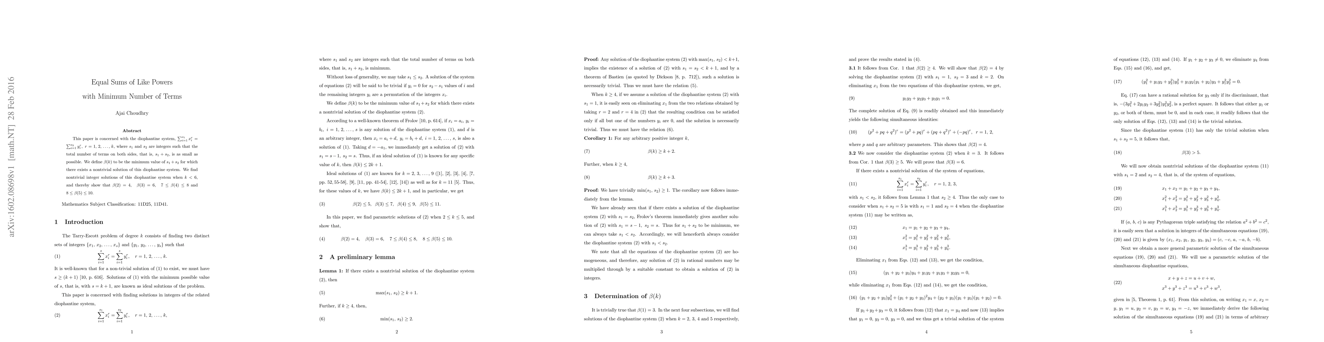 This paper investigates a diophantine system with equal sums of like powers and finds nontrivial integer solutions for k < 6, determining the minimum number of terms needed to achieve equality.