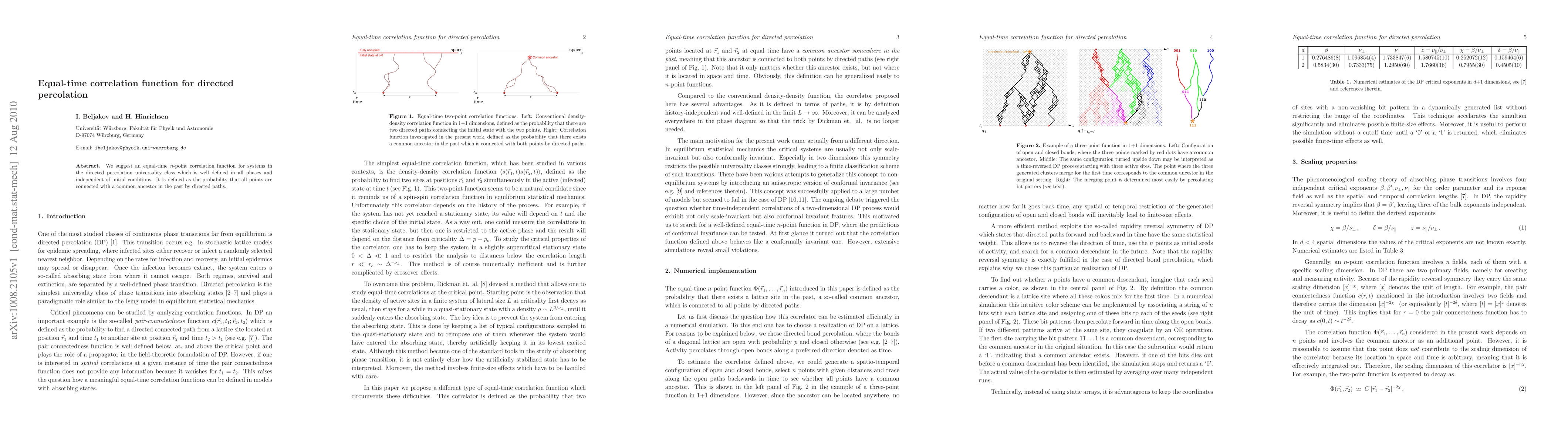 We suggest an equal-time n-point correlation function for systems in the directed percolation universality class which is well defined in all phases and independent of initial conditions. It is defined as the probability that all points are connected with a common ancestor in the past by directed paths.