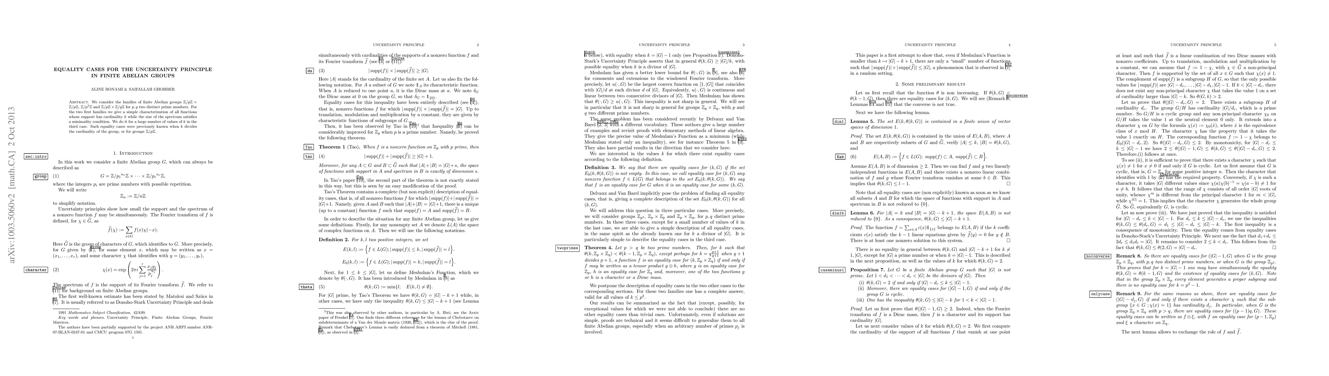 Researchers investigate the equality cases of the uncertainty principle in finite Abelian groups, focusing on specific types of groups and characterizing functions with a certain property.