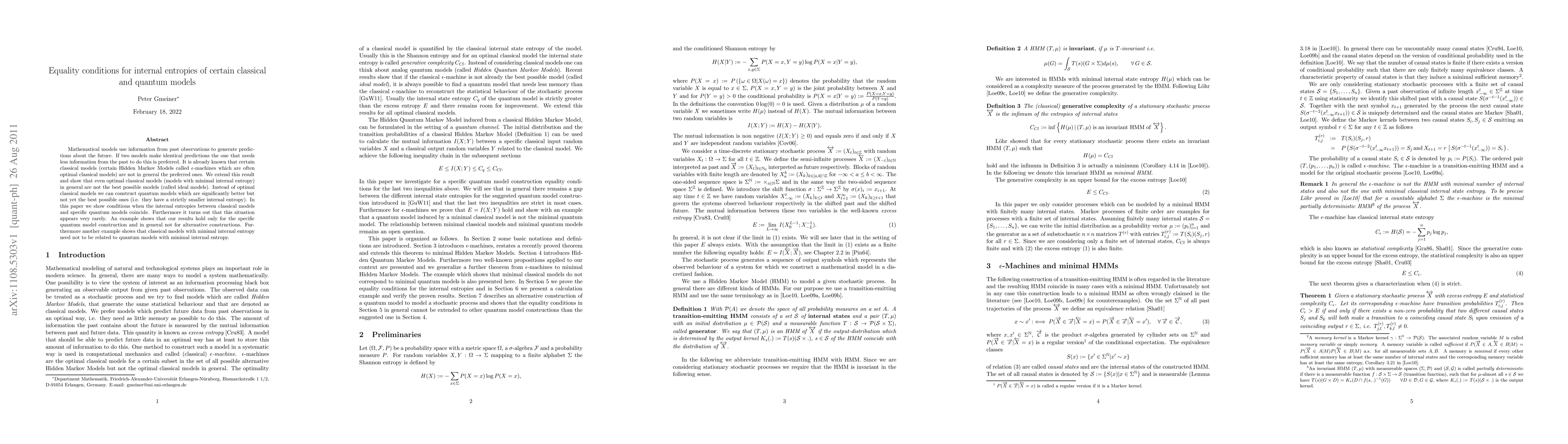 Mathematical models use information from past observations to generate predictions about the future. If two models make identical predictions the one that needs less information from the past to do this is preferred. It is already known that certain classical models (certain Hidden Markov Models called \epsilon-machines which are often optimal classical models) are not in general the preferred ones. We extend this result and show that even optimal classical models (models with minimal internal entropy) in general are not the best possible models (called ideal models). Instead of optimal classical models we can construct quantum models which are significantly better but not yet the best possible ones (i.e. they have a strictly smaller internal entropy). In this paper we show conditions when the internal entropies between classical models and specific quantum models coincide. Furthermore it turns out that this situation appears very rarely. An example shows that our results hold only for the specific quantum model construction and in general not for alternative constructions. Furthermore another example shows that classical models with minimal internal entropy need not to be related to quantum models with minimal internal entropy.