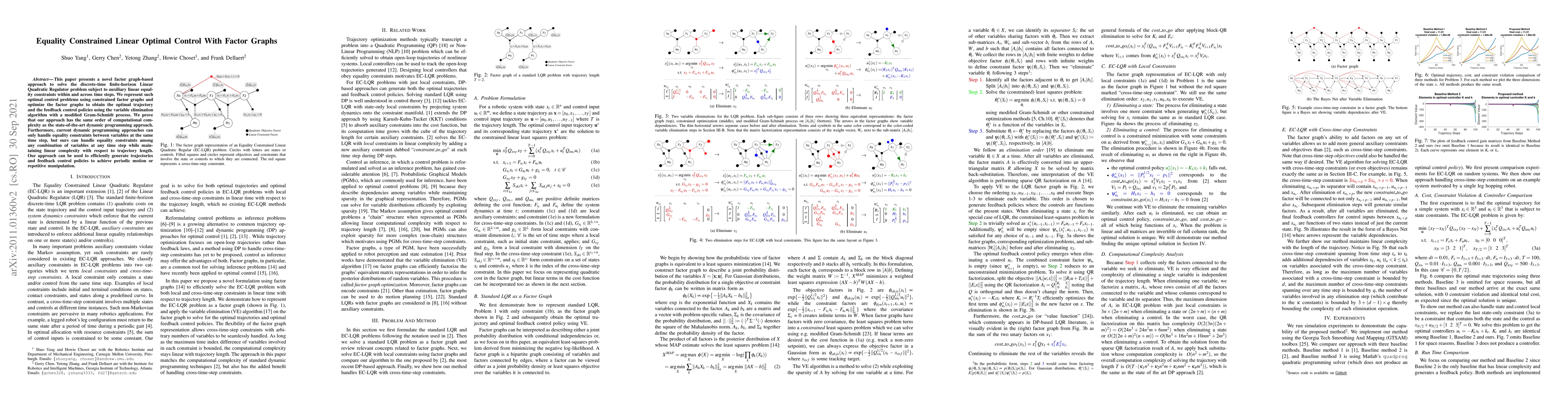 This paper introduces a factor graph-based method to solve the Linear Quadratic Regulator problem with linear equality constraints across time steps, optimizing via variable elimination and modified Gram-Schmidt. It maintains linear complexity and extends constraint handling beyond current dynamic programming methods.