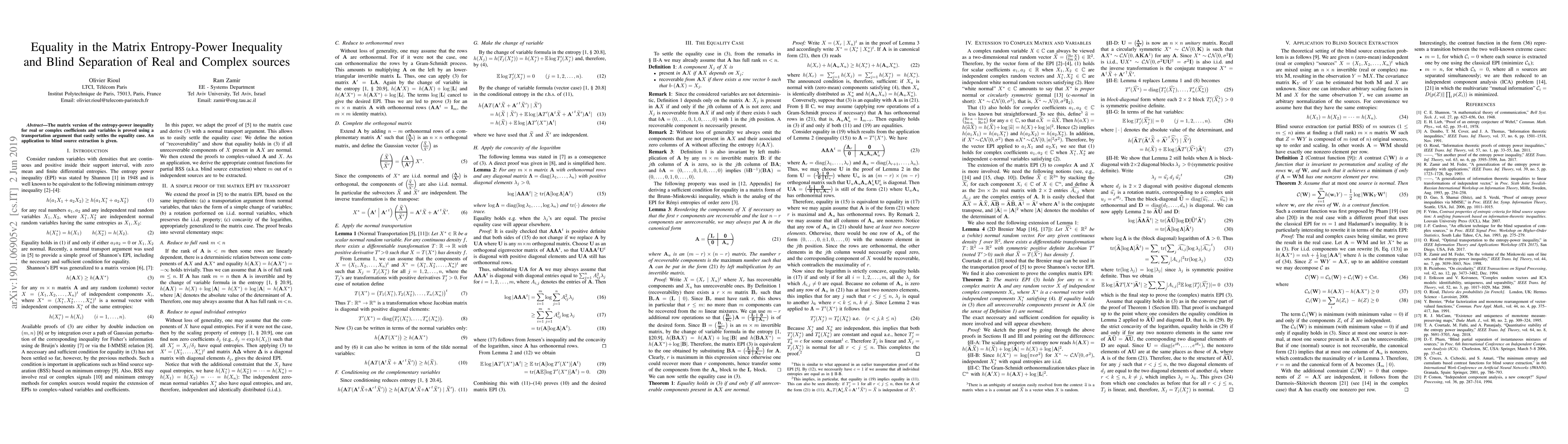 The matrix version of the entropy-power inequality for real or complex coefficients and variables is proved using a transportation argument that easily settles the equality case. An application to blind source extraction is given.