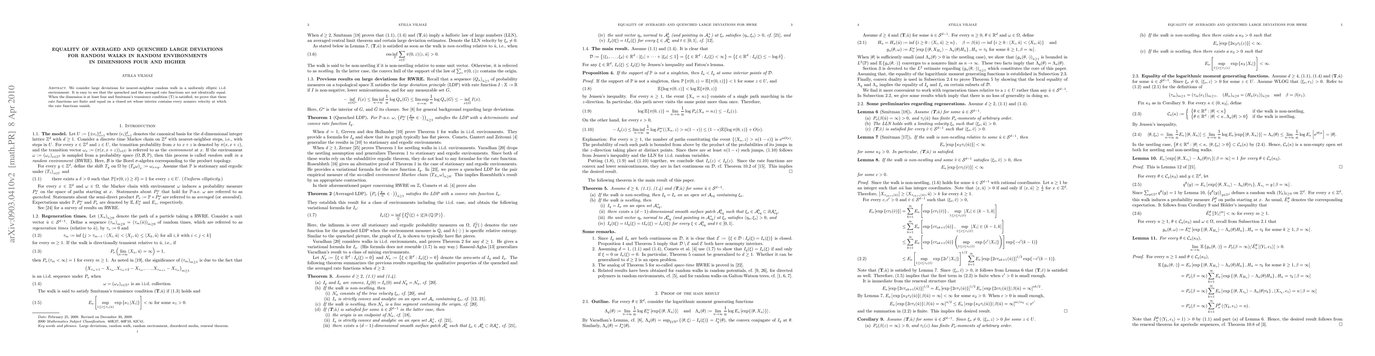 This paper proves that in dimensions four and higher, for a nearest-neighbor random walk in a uniformly elliptic i.i.d. random environment, the averaged and quenched large deviation rate functions are equal on a closed set containing all nonzero velocities where they vanish, provided that Sznitman's transience condition (T) is met.