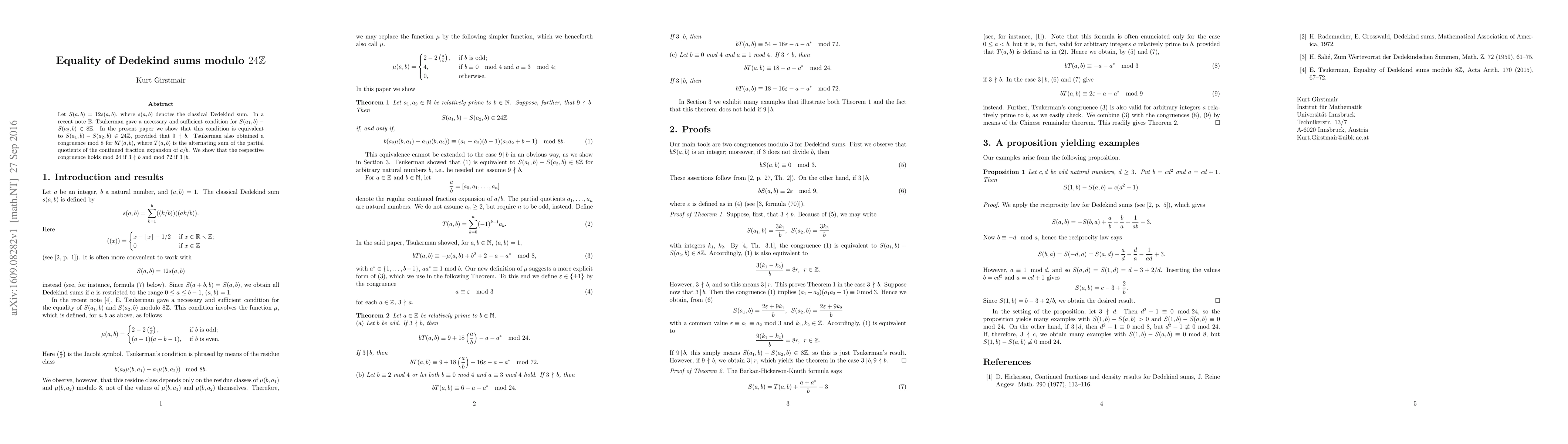 This paper extends Tsukerman's results on Dedekind sums, proving that the condition for $S(a_1,b)-S(a_2,b)$ to be in $8\mathbb Z$ is equivalent to it being in $24\mathbb Z$ when $9\nmid b$. It also establishes congruences for $bT(a,b)$ modulo $24$ if $3\nmid b$ and modulo $72$ if $3\mid b$.