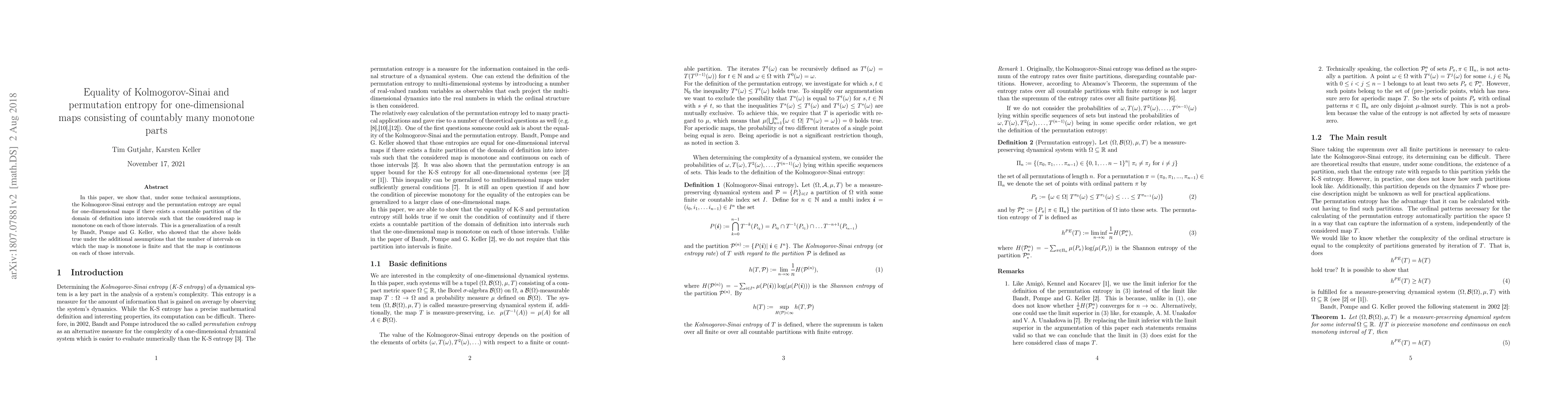 In this paper, we show that, under some technical assumptions, the Kolmogorov-Sinai entropy and the permutation entropy are equal for one-dimensional maps if there exists a countable partition of the domain of definition into intervals such that the considered map is monotone on each of those intervals. This is a generalization of a result by Bandt, Pompe and G. Keller, who showed that the above holds true under the additional assumptions that the number of intervals on which the map is monotone is finite and that the map is continuous on each of those intervals.