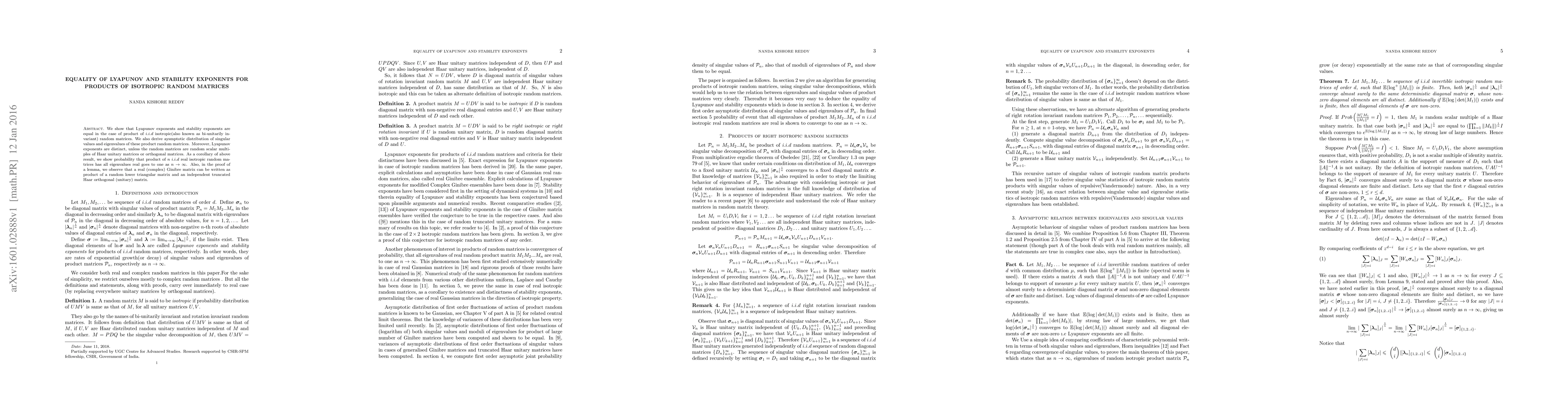 The paper establishes the equality of Lyapunov and stability exponents for products of isotropic random matrices, providing a detailed asymptotic analysis and deriving the distribution of singular values and eigenvalues.