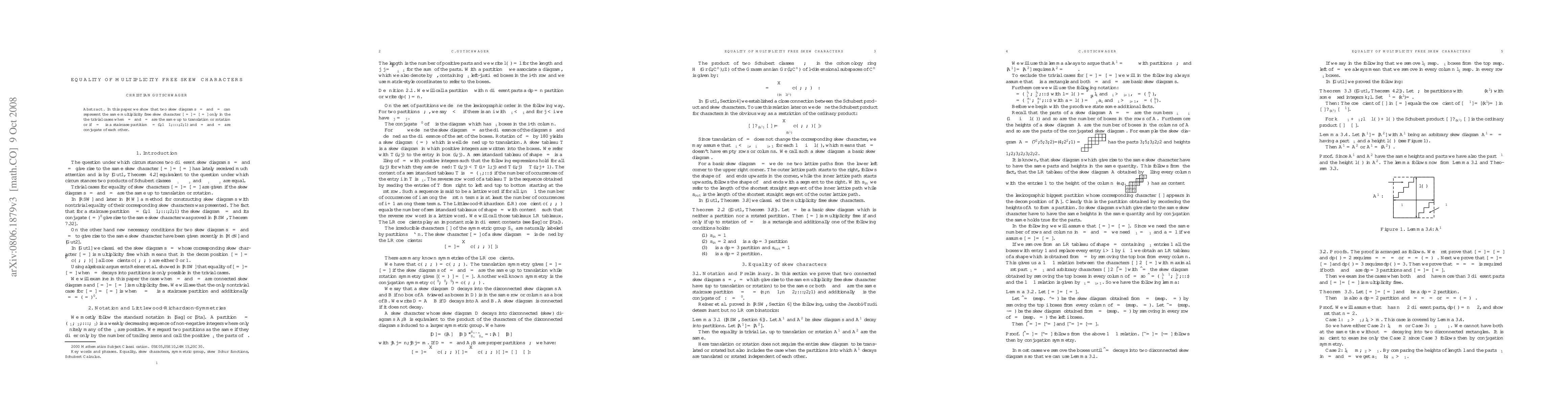 This paper demonstrates that two skew diagrams can represent the same multiplicity free skew character only if they are identical up to translation, rotation, or if they are conjugate and correspond to staircase partitions.