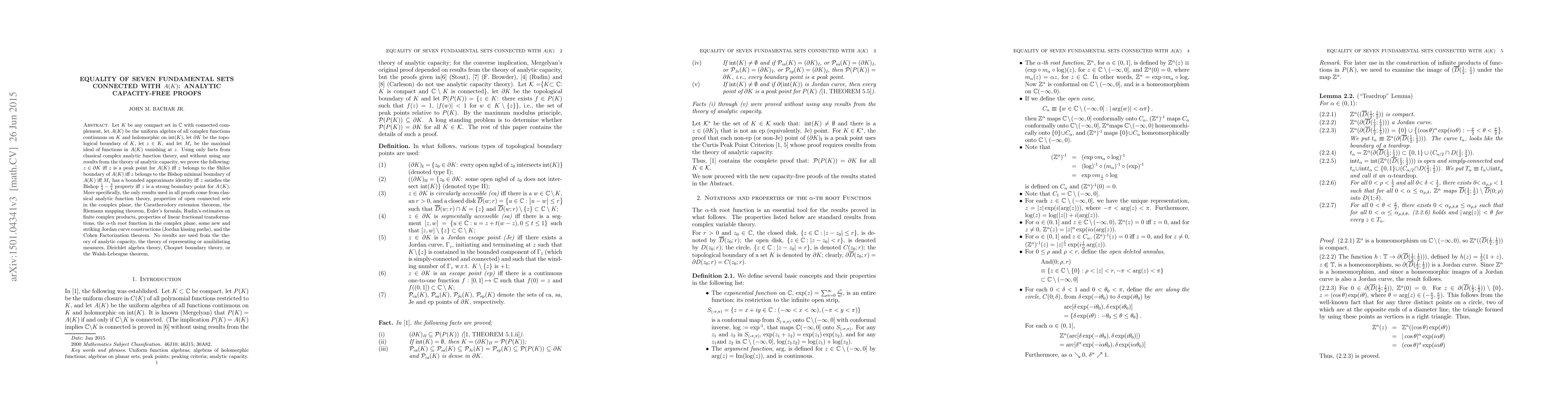 Let K be any compact set in the complex plane that has a connected complement, let A(K) be the uniforn algebra of all continuous complex functions on K that are holomorphic on the interior of K, let bK be the topological boundary of K, let z be in K, and let M be the maximal ideal of functions in A(K) that are 0 at z. Using only facts from classical complex analytic function theory, and without using any results from the theory of analytic capacity, we prove the following: z is an element of bK iff z is a peak point for A(K) iff z belongs to the Shilov boundary for A(K) iff z belongs to the Bishop minimal boundary for A(K) iff M has a bounded approximate identity iff the Bishop one-quarter - three-quarter property holds at z iff z is a strong boundary point for A(K). More specifically, the only results used in all proofs are from classical complex analytic function theory, properties of open connected sets in the complex plane, the Caratheodory extension theorem, the Riemann mapping theorem, Euler's formula, Rudin's estimates for finite complex products, properties of linear fractional transformations, the alpha root function in the complex plane, some new and striking Jordan curve constructions (Jordan kissing paths), and the Cohen factorization theorem. No results are used from the theory of analytic capacity, the theory of representing or annihilating measures, Dirichlet algebra theory, Choquet boundary theory, or the Walsh-Lebesgue theorem.