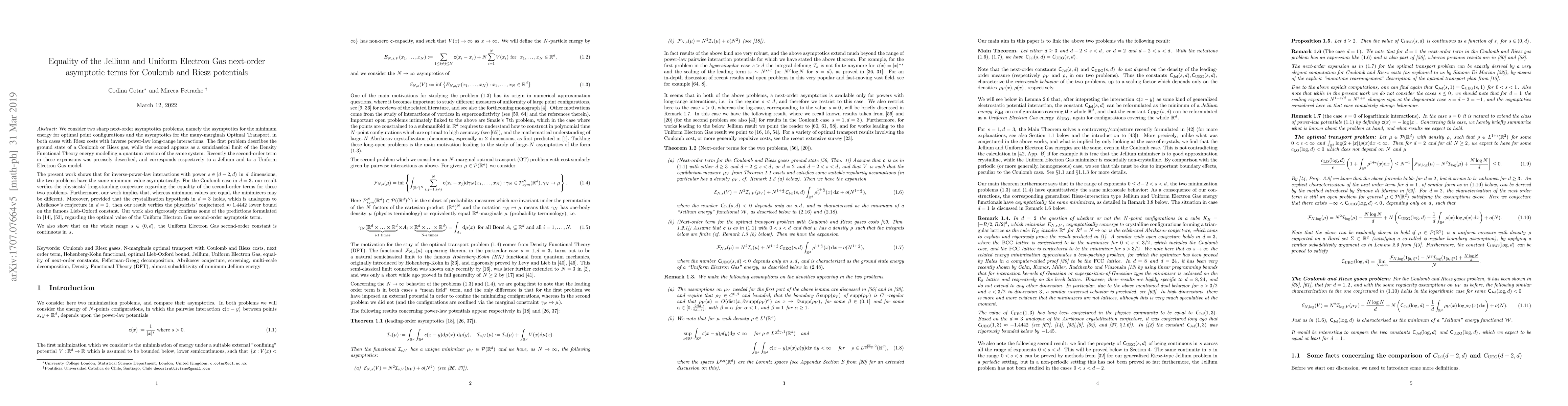 We consider two sharp next-order asymptotics problems, namely the asymptotics for the minimum energy for optimal point configurations and the asymptotics for the many-marginals Optimal Transport, in both cases with Riesz costs with inverse power-law long range interactions. The first problem describes the ground state of a Coulomb or Riesz gas, while the second appears as a semiclassical limit of the Density Functional Theory energy modelling a quantum version of the same system. Recently the second-order term in these expansions was precisely described, and corresponds respectively to a Jellium and to a Uniform Electron Gas model. The present work shows that for inverse-power-law interactions with power $s\in [d-2,d)$ in $d$ dimensions, the two problems have the same minimum value asymptotically. For the Coulomb case in $d=3$, our result verifies the physicists' long-standing conjecture regarding the equality of the second-order terms for these two problems. Furthermore, our work implies that, whereas minimum values are equal, the minimizers may be different. Moreover, provided that the crystallization hypothesis in $d=3$ holds, which is analogous to Abrikosov's conjecture in $d=2$, then our result verifies the physicists' conjectured $\approx 1.4442$ lower bound on the famous Lieb-Oxford constant. Our work also rigorously confirms some of the predictions formulated by physicists, regarding the optimal value of the Uniform Electron Gas second-order asymptotic term. We also show that on the whole range $s\in(0,d)$, the Uniform Electron Gas second-order constant is continuous in $s$.