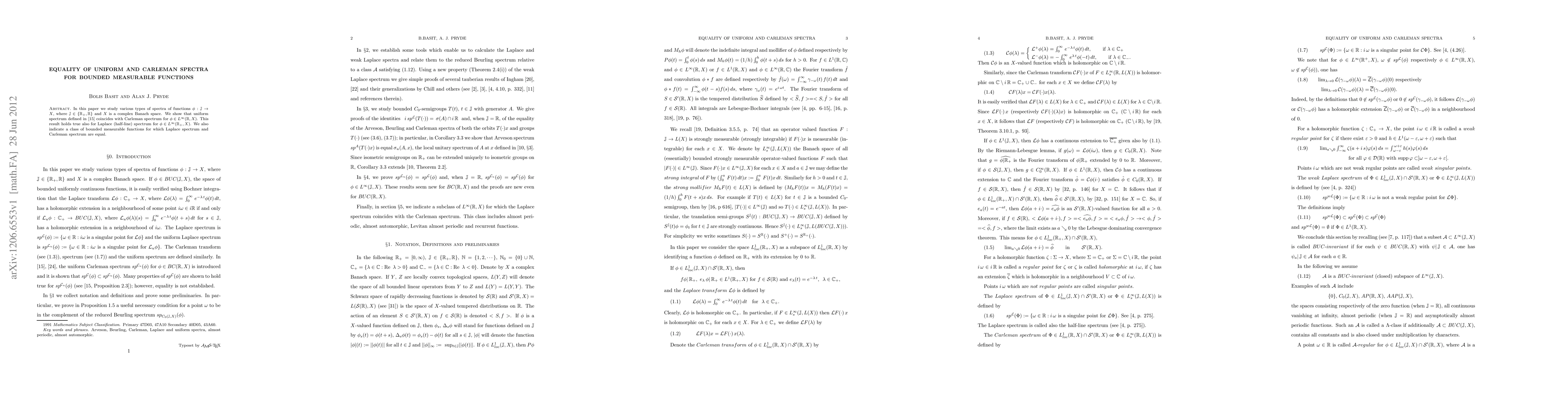In this paper we study various types of spectra of functions $\phi:\jj\to X$, where $\jj\in\{\r_+,\r\}$ and $X$ is a complex Banach space. We show that uniform spectrum defined in [15] coincides with Carleman spectrum for $\phi\in L^{\infty}(\r,X)$. This result holds true also for Laplace (half-line) spectrum for $\phi\in L^{\infty}(\r_+,X)$. We also indicate a class of bounded measurable functions for which Laplace spectrum and Carleman spectrum are equal