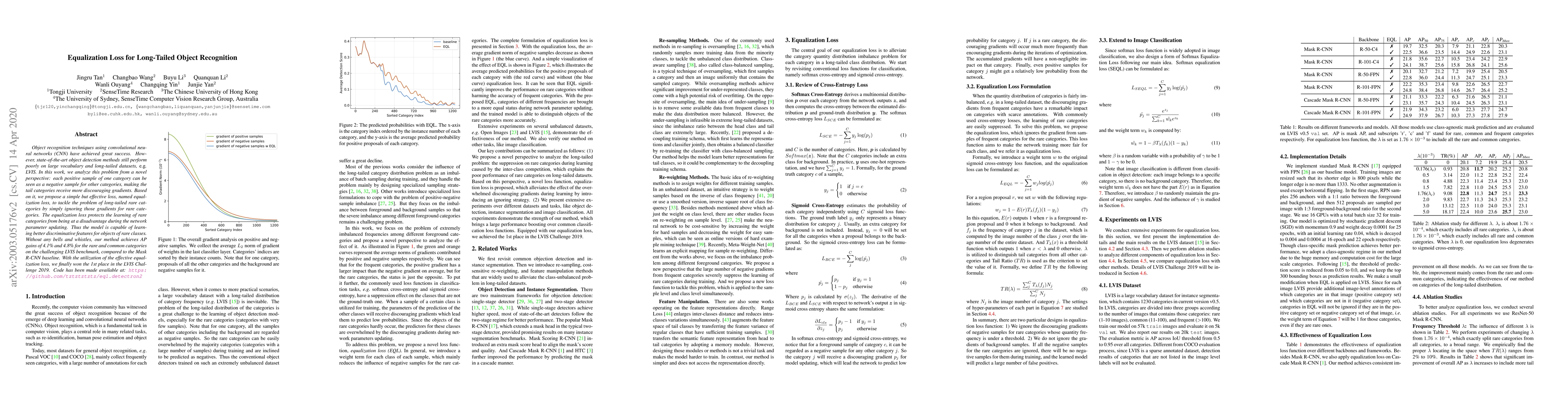 This paper proposes an equalization loss to address long-tailed object recognition challenges in CNNs, which improves learning for rare categories by mitigating discouraging gradients. The method achieved significant gains on the LVIS benchmark and won the LVIS Challenge 2019.