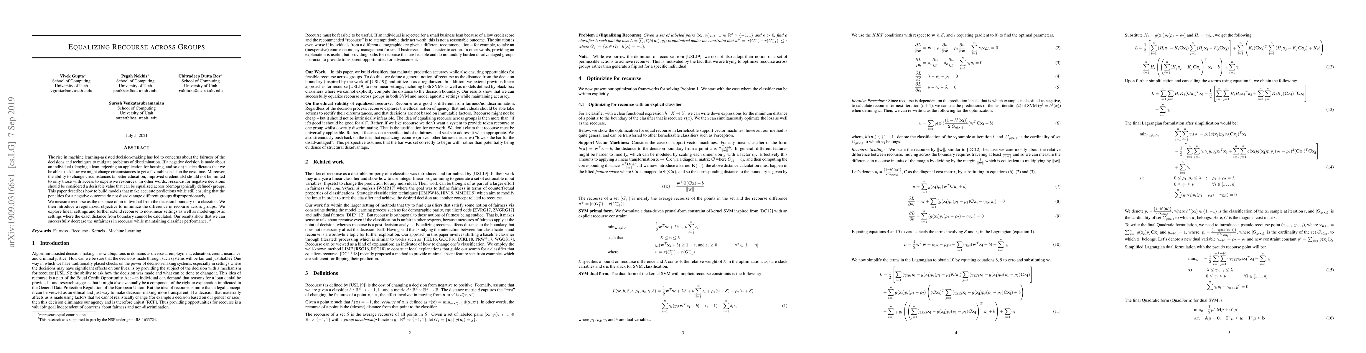 The rise in machine learning-assisted decision-making has led to concerns about the fairness of the decisions and techniques to mitigate problems of discrimination. If a negative decision is made about an individual (denying a loan, rejecting an application for housing, and so on) justice dictates that we be able to ask how we might change circumstances to get a favorable decision the next time. Moreover, the ability to change circumstances (a better education, improved credentials) should not be limited to only those with access to expensive resources. In other words, \emph{recourse} for negative decisions should be considered a desirable value that can be equalized across (demographically defined) groups. This paper describes how to build models that make accurate predictions while still ensuring that the penalties for a negative outcome do not disadvantage different groups disproportionately. We measure recourse as the distance of an individual from the decision boundary of a classifier. We then introduce a regularized objective to minimize the difference in recourse across groups. We explore linear settings and further extend recourse to non-linear settings as well as model-agnostic settings where the exact distance from boundary cannot be calculated. Our results show that we can successfully decrease the unfairness in recourse while maintaining classifier performance.