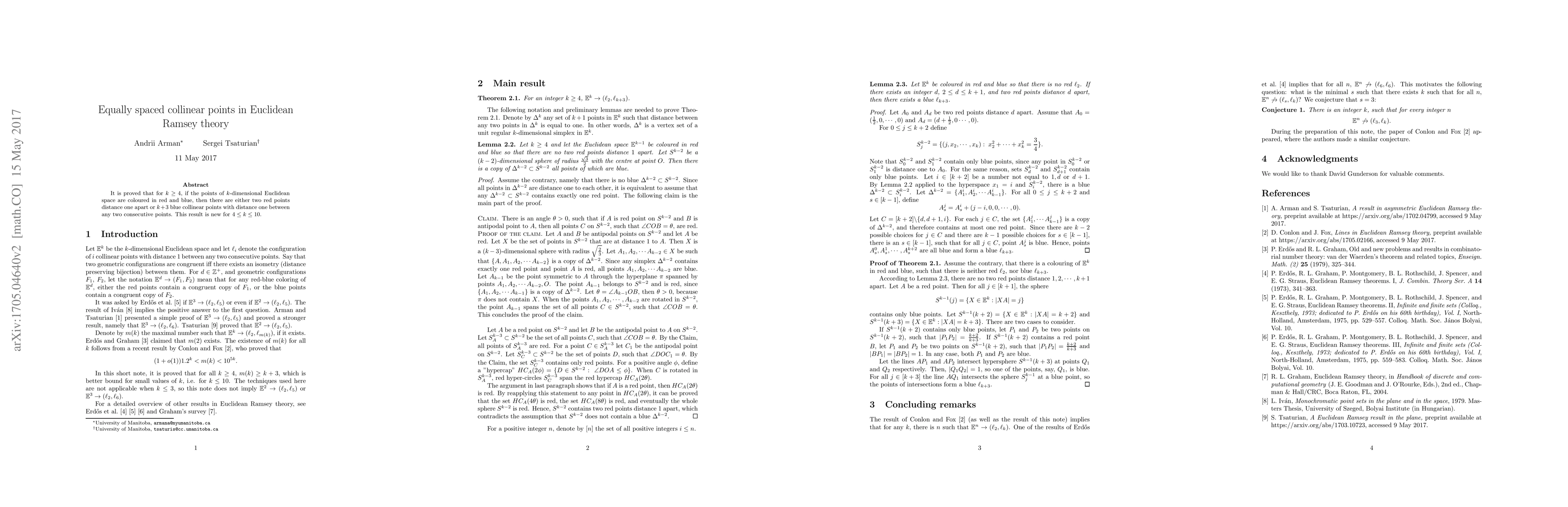 Researchers proved that in k-dimensional Euclidean space, points colored red and blue will either have two consecutive red points one unit apart or k+3 blue collinear points with a distance of one unit between each pair, for k greater than or equal to 4.