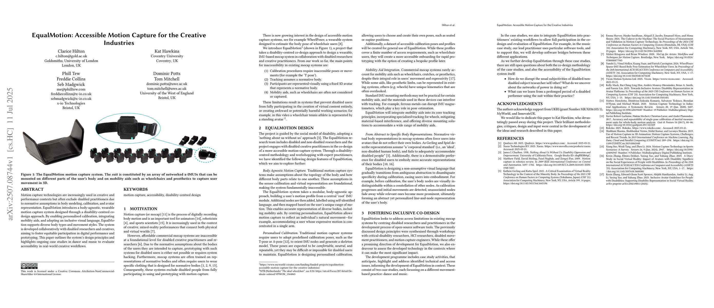 Motion capture technologies are increasingly used in creative and performance contexts but often exclude disabled practitioners due to normative assumptions in body modeling, calibration, and avatar representation. EqualMotion introduces a body-agnostic, wearable motion capture system designed through a disability-centred co-design approach. By enabling personalised calibration, integrating mobility aids, and adopting an inclusive visual language, EqualMotion supports diverse body types and movement styles. The system is developed collaboratively with disabled researchers and creatives, aiming to foster equitable participation in digital performance and prototyping. This paper outlines the system's design principles and highlights ongoing case studies in dance and music to evaluate accessibility in real-world creative workflows.