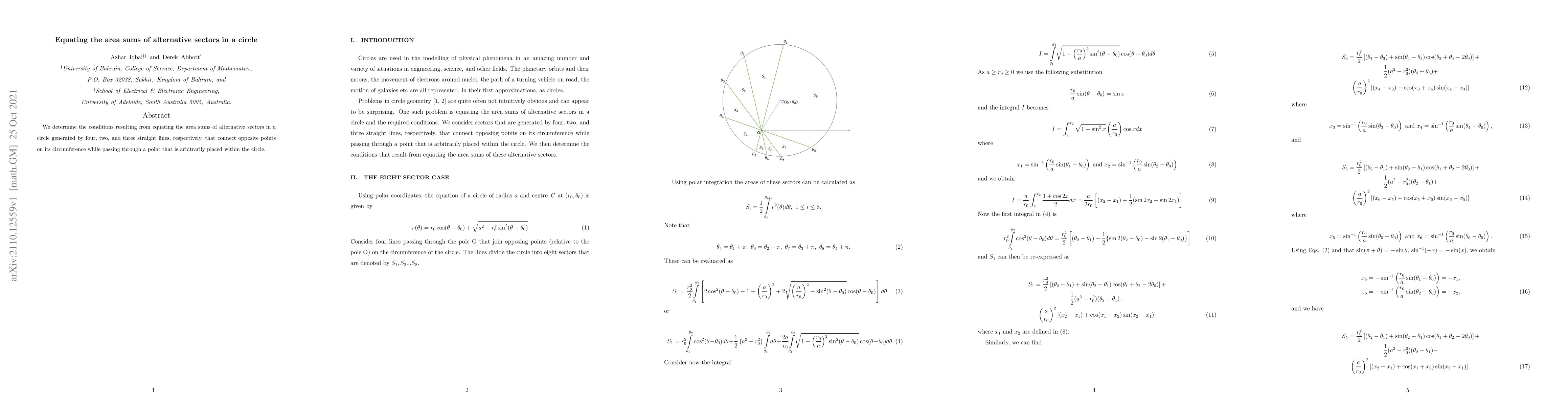 We determine the conditions resulting from equating the area sums of alternative sectors in a circle generated by four, two, and three straight lines, respectively, that connect opposite points on its circumference while passing through a point that is arbitrarily placed within the circle.