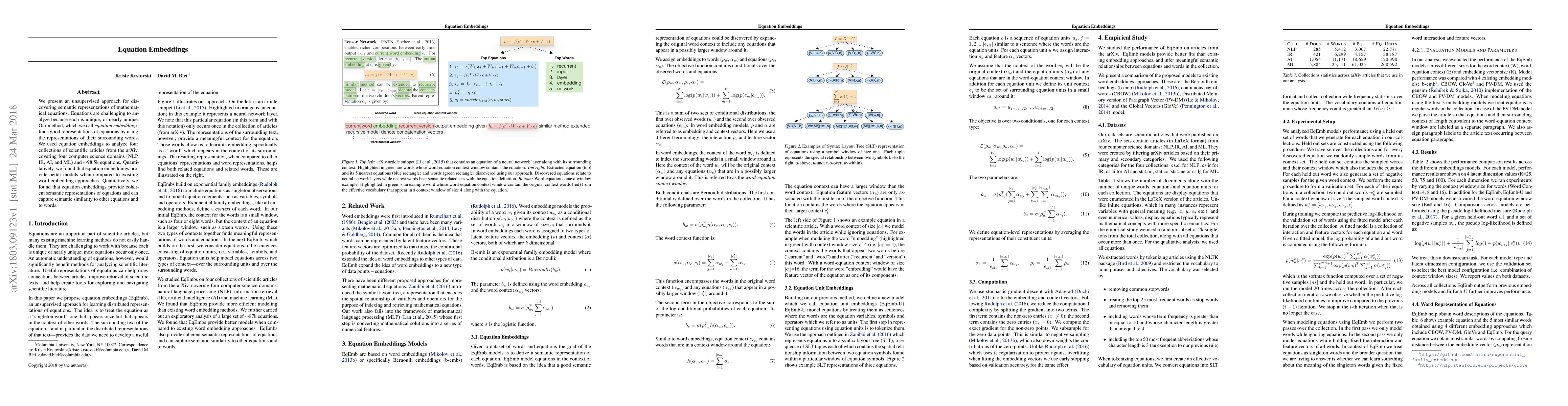 We present an unsupervised approach for discovering semantic representations of mathematical equations. Equations are challenging to analyze because each is unique, or nearly unique. Our method, which we call equation embeddings, finds good representations of equations by using the representations of their surrounding words. We used equation embeddings to analyze four collections of scientific articles from the arXiv, covering four computer science domains (NLP, IR, AI, and ML) and $\sim$98.5k equations. Quantitatively, we found that equation embeddings provide better models when compared to existing word embedding approaches. Qualitatively, we found that equation embeddings provide coherent semantic representations of equations and can capture semantic similarity to other equations and to words.