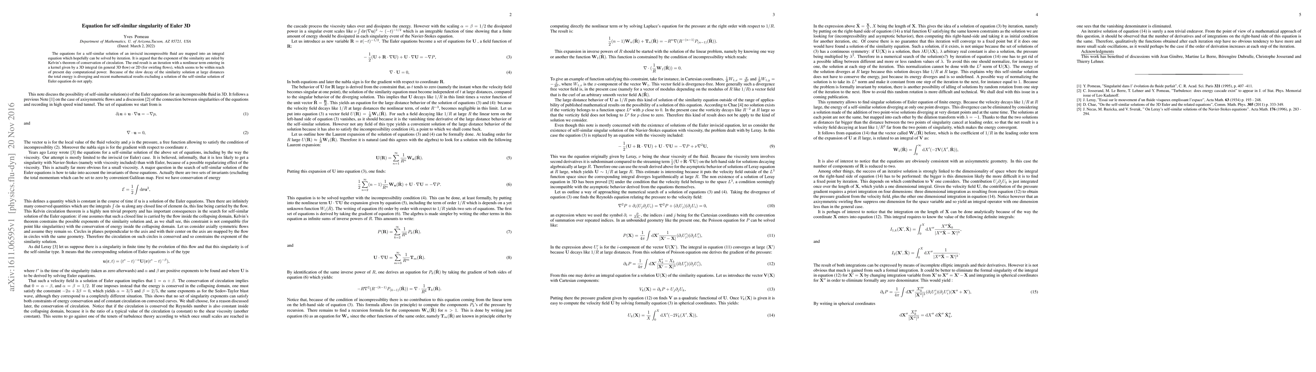 The equations for a self-similar solution of an inviscid incompressible fluid are mapped into an integral equation which hopefully can be solved by iteration. It is argued that the exponent of the similarity are ruled by Kelvin's theorem of conservation of circulation. The end result is an iteration with a nonlinear term entering in a kernel given by a 3D integral (in general 3D flow) or 2D (for swirling flows), which seems to be within reach of present day computational power. Because of the slow decay of the similarity solution at large distances the total energy is diverging and recent mathematical results excluding a solution of the self-similar solution of Euler equation do not apply.