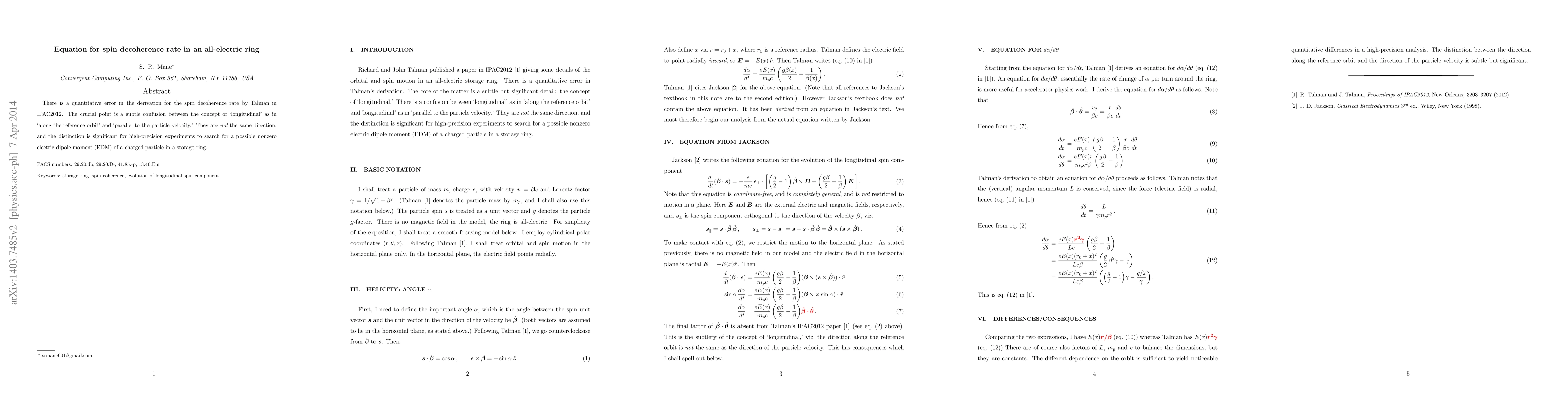 There is a quantitative error in the derivation for the spin decoherence rate by Talman in IPAC2012. The crucial point is a subtle confusion between the concept of `longitudinal' as in `along the reference orbit' and `parallel to the particle velocity.' They are $\it not$ the same direction, and the distinction is significant for high-precision experiments to search for a possible nonzero electric dipole moment (EDM) of a charged particle in a storage ring.