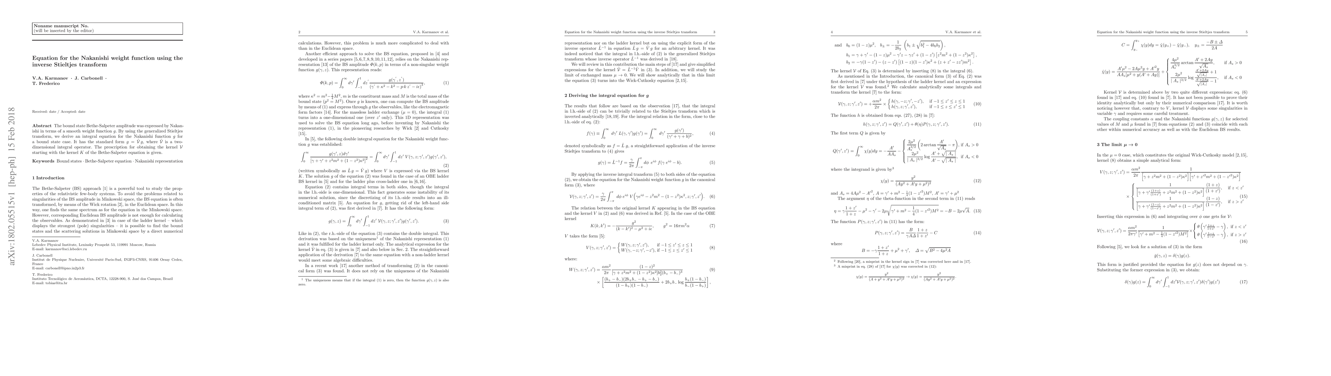 This paper derives an integral equation for the Nakanishi weight function using the generalized inverse Stieltjes transform, expressing it as g = Vg, where V is a two-dimensional integral operator derived from the Bethe-Salpeter equation kernel K.
