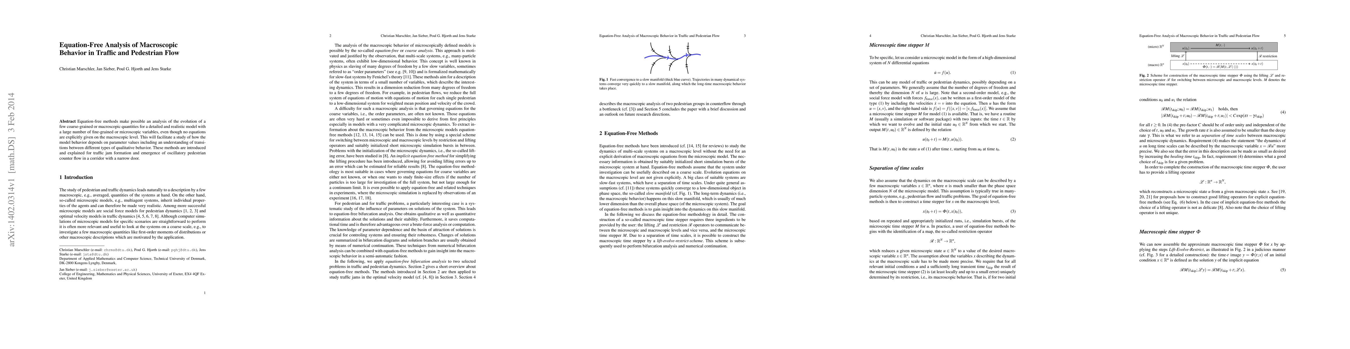 Equation-free methods make possible an analysis of the evolution of a few coarse-grained or macroscopic quantities for a detailed and realistic model with a large number of fine-grained or microscopic variables, even though no equations are explicitly given on the macroscopic level. This will facilitate a study of how the model behavior depends on parameter values including an understanding of transitions between different types of qualitative behavior. These methods are introduced and explained for traffic jam formation and emergence of oscillatory pedestrian counter flow in a corridor with a narrow door.
