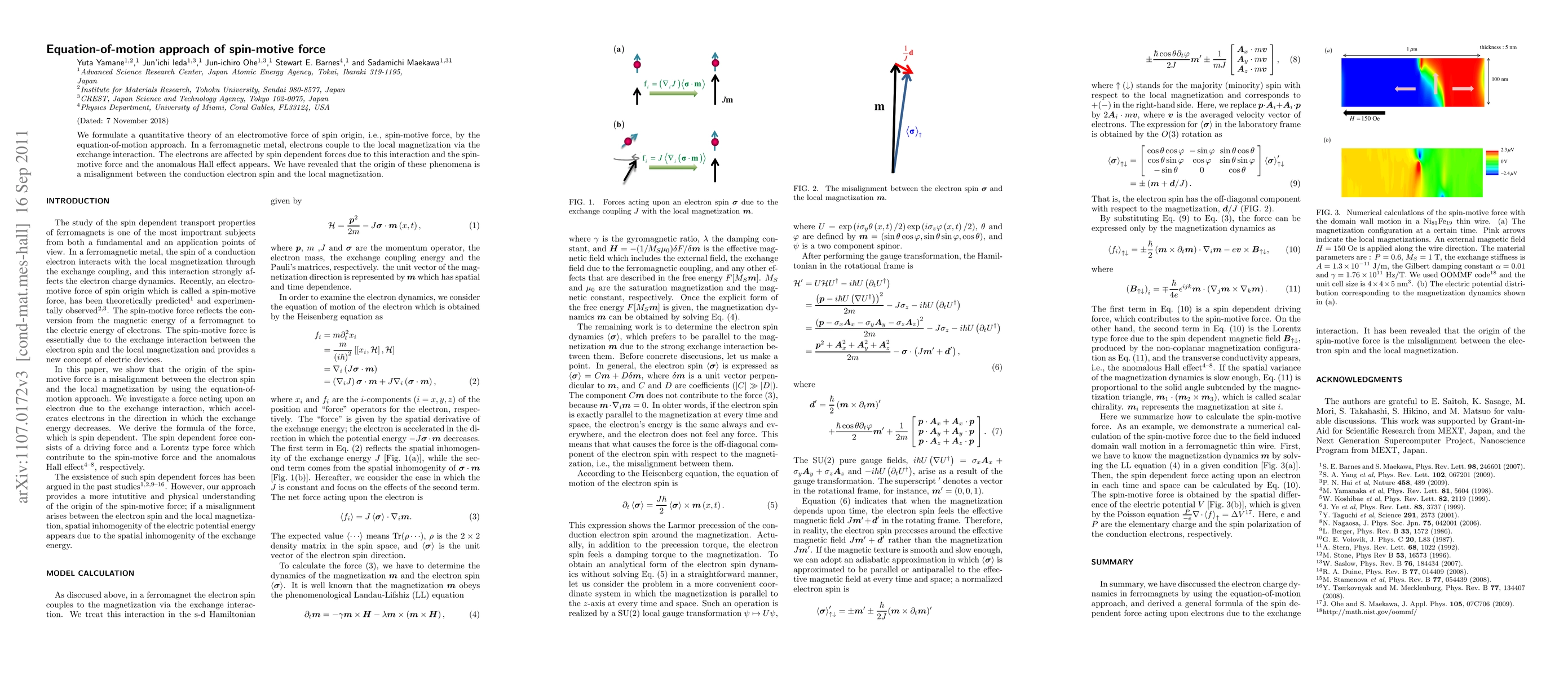 We formulate a quantitative theory of an electromotive force of spin origin, i.e., spin-motive force, by the equation-of-motion approach. In a ferromagnetic metal, electrons couple to the local magnetization via the exchange interaction. Electrons feel spin dependent forces due to this interaction, and then the spin-motive force and the anomalous Hall effect appears. We have revealed that the origin of these phenomena is a misalignment between the conduction electron spin and the local magnetization.