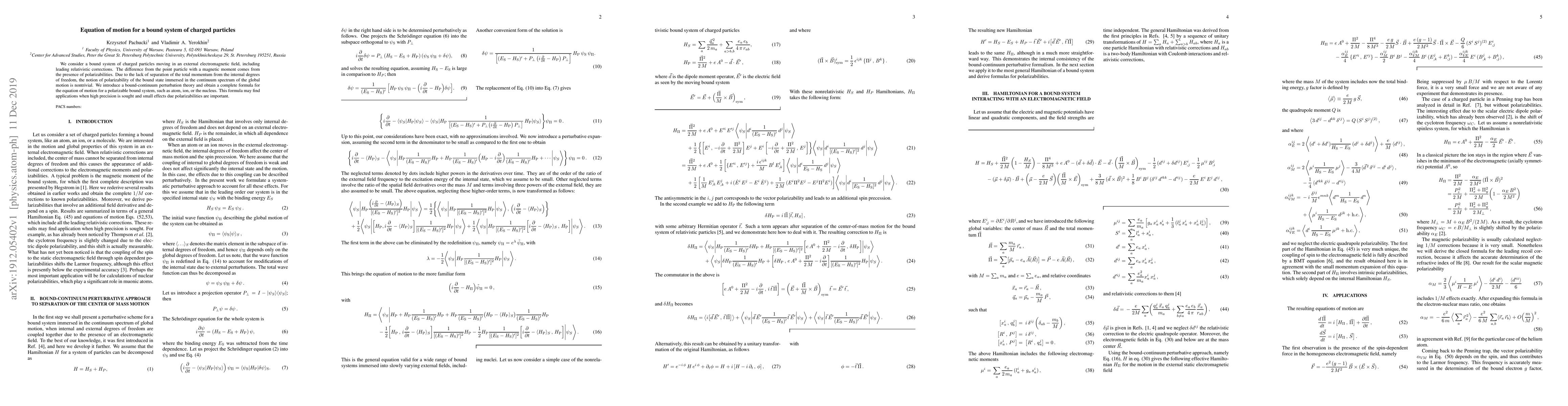 This paper develops an equation of motion for charged particles in a bound system, including relativistic corrections and polarizabilities. It introduces a bound-continuum perturbation theory to address the complexities of internal degrees of freedom and provides a comprehensive formula applicable to atoms, ions, or nuclei, useful for high-precision scenarios.