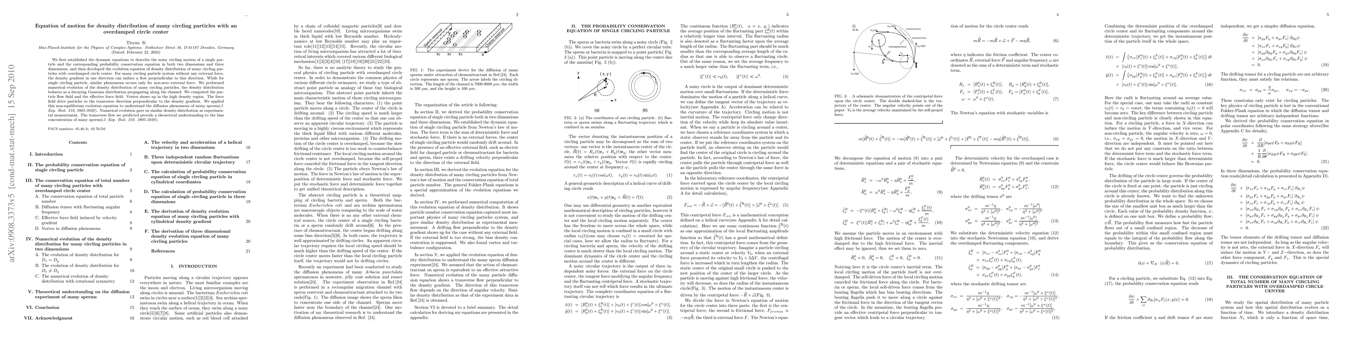 We first established the dynamic equations to describe the noisy circling motion of a single particle and the corresponding probability conservation equation in both two dimensions and three dimensions, and then developed the evolution equation of density distribution of many circling particles with overdamped circle center. For many circling particle system without any external force, the density gradient in one direction can induce a flow perpendicular to this direction. While for single circling particle, similar phenomena occurs only for non-zero external force. We performed numerical evolution of the density distribution of many circling particles, the density distribution behaves as a decaying Gaussian distribution propagating along the channel. We computed the particle flow field and the effective force field. Vortex shows up in the high density region. The force field drive particles to the transverse direction perpendicular to the density gradient. We applied this non-equilibrium evolution equation to understand the diffusion phenomena of many sperms(J. Exp. Biol. 210, 3805-3820). Numerical evolution gave us similar density distribution as experimental measurement. The transverse flow we predicted provide a theoretical understanding to the bias concentration of many sperms(J. Exp. Biol. 210. 3805-3820).
