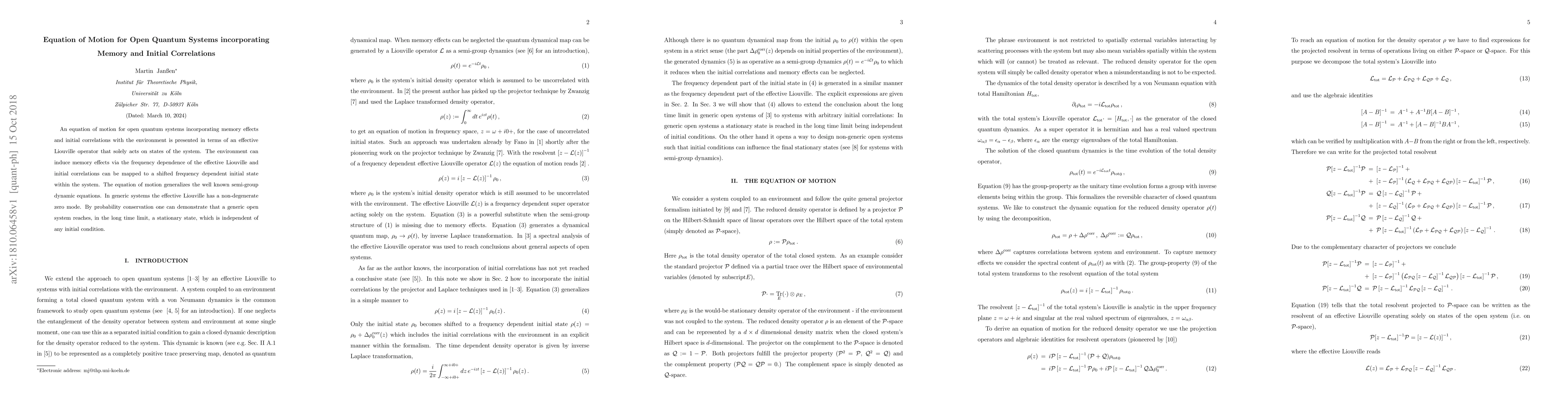 This paper presents an equation of motion for open quantum systems that accounts for memory effects and initial correlations with the environment through an effective Liouville operator. It generalizes semi-group dynamic equations and shows that systems tend to a stationary state independent of the initial condition over long times.