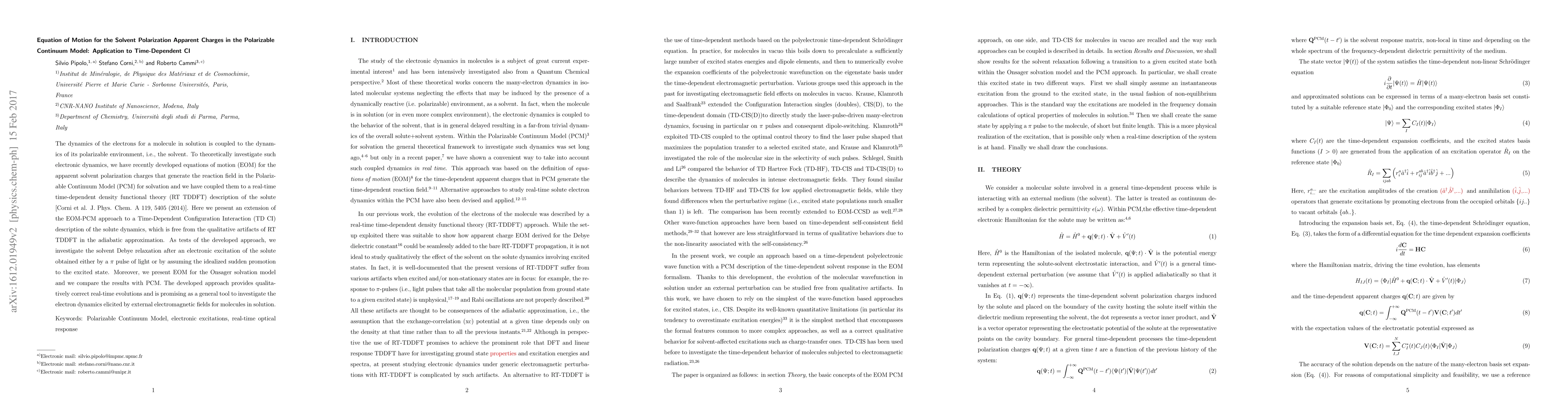 The dynamics of the electrons for a molecule in solution is coupled to the dynamics of its polarizable environment, i.e., the solvent. To theoretically investigate such electronic dynamics, we have recently developed equations of motion (EOM) for the apparent solvent polarization charges that generate the reaction field in the Polarizable Continuum Model (PCM) for solvation and we have coupled them to a real-time time-dependent density functional theory (RT TDDFT) description of the solute [Corni et al. J. Phys. Chem. A 119, 5405 (2014)]. Here we present an extension of the EOM-PCM approach to a Time-Dependent Configuration Interaction (TD CI) description of the solute dynamics, which is free from the qualitative artifacts of RT TDDFT in the adiabatic approximation. As tests of the developed approach, we investigate the solvent Debye relaxation after an electronic excitation of the solute obtained either by a $\pi$ pulse of light or by assuming the idealized sudden promotion to the excited state. Moreover, we present EOM for the Onsager solvation model and we compare the results with PCM. The developed approach provides qualitatively correct real-time evolutions and is promising as a general tool to investigate the electron dynamics elicited by external electromagnetic fields for molecules in solution.