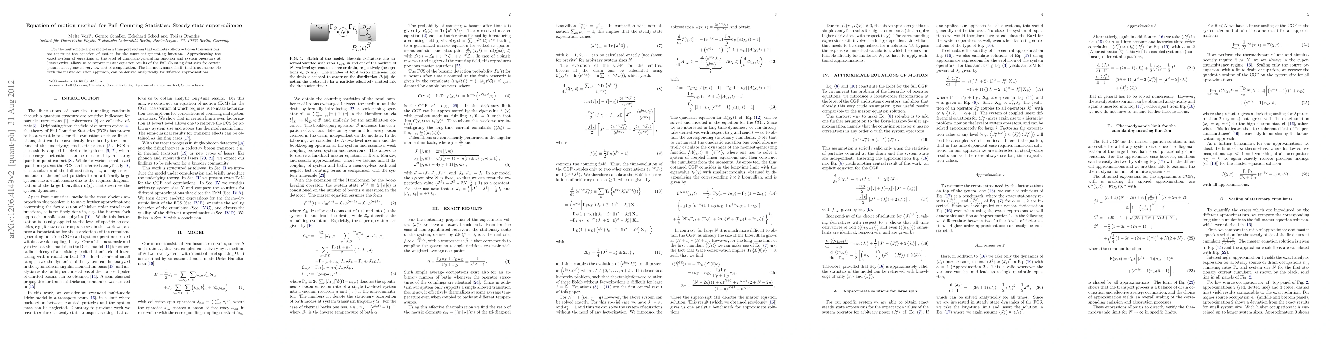 For the multi-mode Dicke model in a transport setting that exhibits collective boson transmissions, we construct the equation of motion for the cumulant generating function. Approximating the exact system of equations at the level of cumulant generating function and system operators at lowest order, allows us to recover master equation results of the Full Counting Statistics for certain parameter regimes at very low cost of computation. The thermodynamic limit, that is not accessible with the master equation approach, can be derived analytically for different approximations.