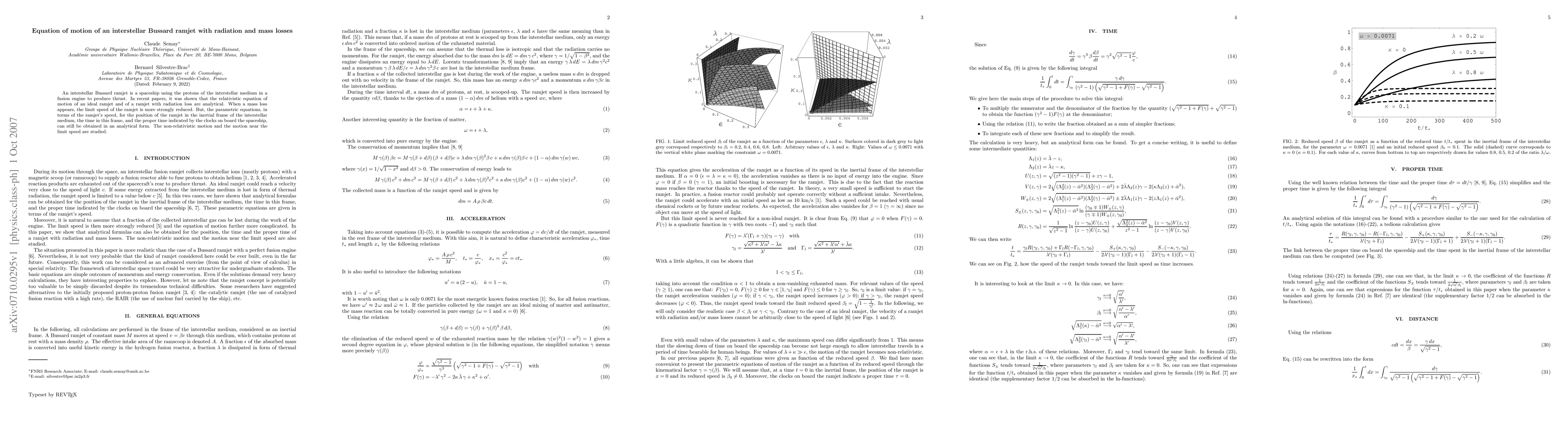 An interstellar Bussard ramjet is a spaceship using the protons of the interstellar medium in a fusion engine to produce thrust. In recent papers, it was shown that the relativistic equation of motion of an ideal ramjet and of a ramjet with radiation loss are analytical. When a mass loss appears, the limit speed of the ramjet is more strongly reduced. But, the parametric equations, in terms of the ramjet's speed, for the position of the ramjet in the inertial frame of the interstellar medium, the time in this frame, and the proper time indicated by the clocks on board the spaceship, can still be obtained in an analytical form. The non-relativistic motion and the motion near the limit speed are studied.