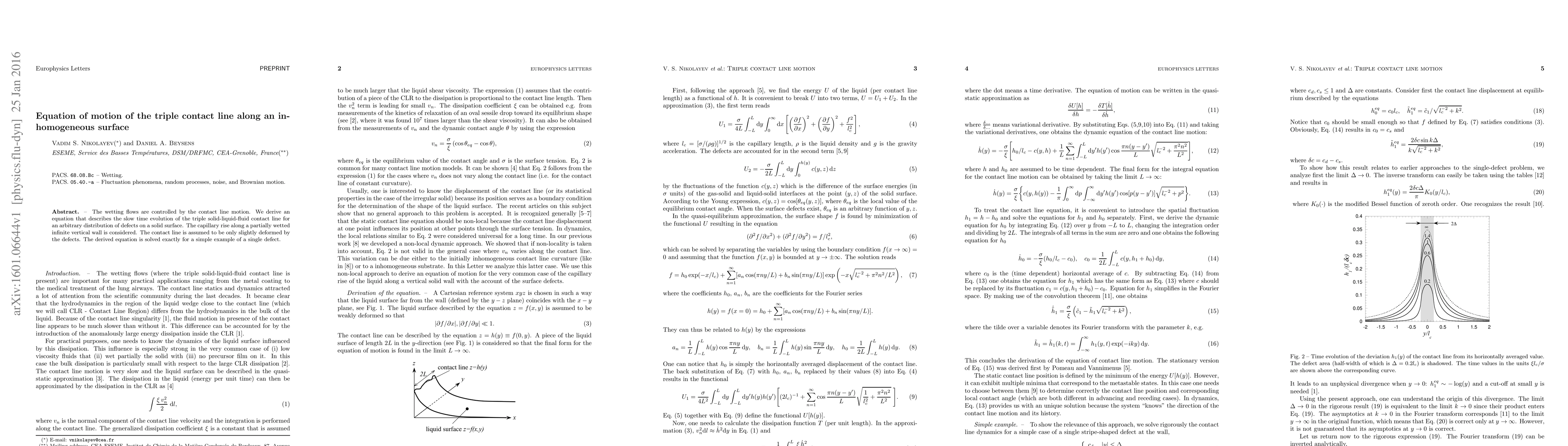 Wetting flows are controlled by the contact line motion. We derive an equation that describes the slow time evolution of the triple solid-liquid-fluid contact line for an arbitrary distribution of defects on a solid surface. The capillary rise along a partially wetted infinite vertical wall is considered. The contact line is assumed to be only slightly deformed by the defects. The derived equation is solved exactly for a simple example of a single defect. Introduction.
