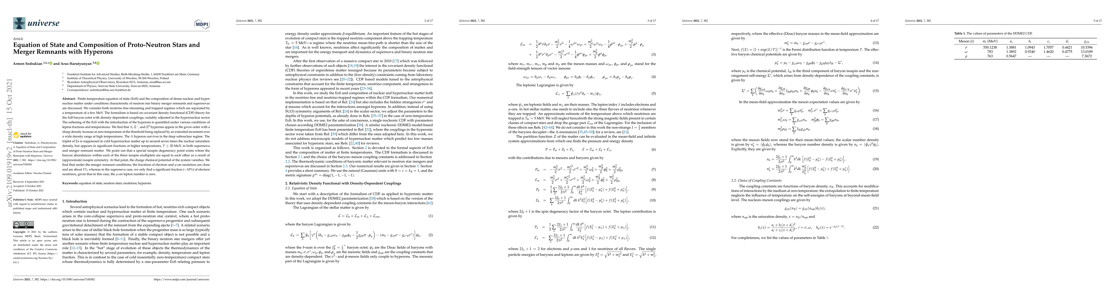 Finite-temperature equation of state (EoS) and the composition of dense nuclear and hypernuclear matter under conditions characteristic of neutron star binary merger remnants and supernovas are discussed. We consider both neutrino free-streaming and trapped regimes which are separated by a temperature of a few MeV. The formalism is based on covariant density functional (CDF) theory for the full baryon octet with density-dependent couplings, suitably adjusted in the hypernuclear sector. The softening of the EoS with the introduction of the hyperons is quantified under various conditions of lepton fractions and temperatures. We find that $\Lambda$, $\Xi^-$, and $\Xi^0$ hyperons appear in the given order with a sharp density increase at zero temperature at the threshold being replaced by an extended increment over a wide density range at high temperatures. The $\Lambda$ hyperon survives in the deep subnuclear regime. The triplet of $\Sigma$s is suppressed in cold hypernuclear matter up to around seven times the nuclear saturation density, but appears in significant fractions at higher temperatures, $T\geq 20$ MeV, in both supernova and merger remnant matter. We point out that a special isospin degeneracy point exists where the baryon abundances within each of the three isospin multiplets are equal to each other as a result of (approximate) isospin symmetry. At that point, the charge chemical potential of the system vanishes. We find that under the merger remnant conditions, the fractions of electron and $\mu$-on neutrinos are close and are about 1\%, whereas in the supernova case, we only find a significant fraction ($\sim$10\%) of electron neutrinos, given that in this case, the $\mu$-on lepton number is zero.
