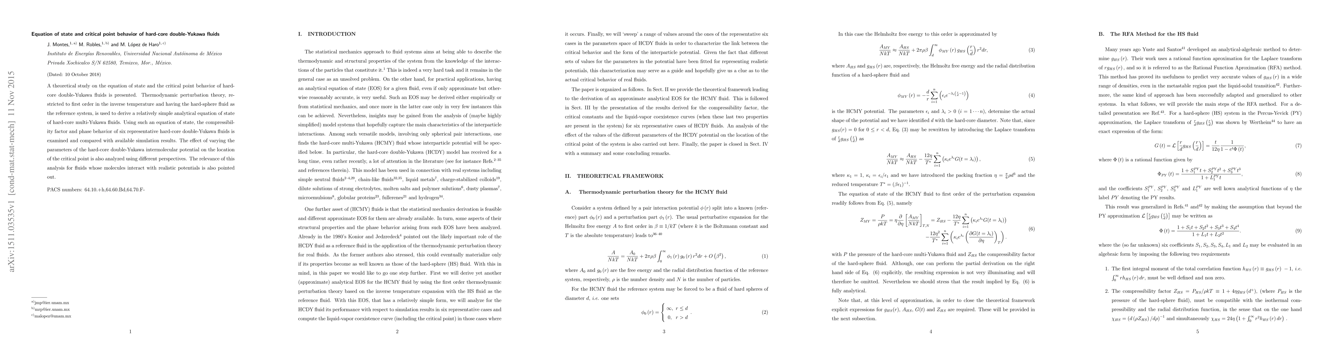 A theoretical study on the equation of state and the critical point behavior of hard-core double-Yukawa fluids is presented. Thermodynamic perturbation theory, restricted to first order in the inverse temperature and having the hard-sphere fluid as the reference system, is used to derive a relatively simple analytical equation of state of hard-core multi-Yukawa fluids. Using such an equation of state, the compressibility factor and phase behavior of six representative hard-core double-Yukawa fluids is examined and compared with available simulation results. The effect of varying the parameters of the hard-core double-Yukawa intermolecular potential on the location of the critical point is also analyzed using different perspectives. The relevance of this analysis for fluids whose molecules interact with realistic potentials is also pointed out.
