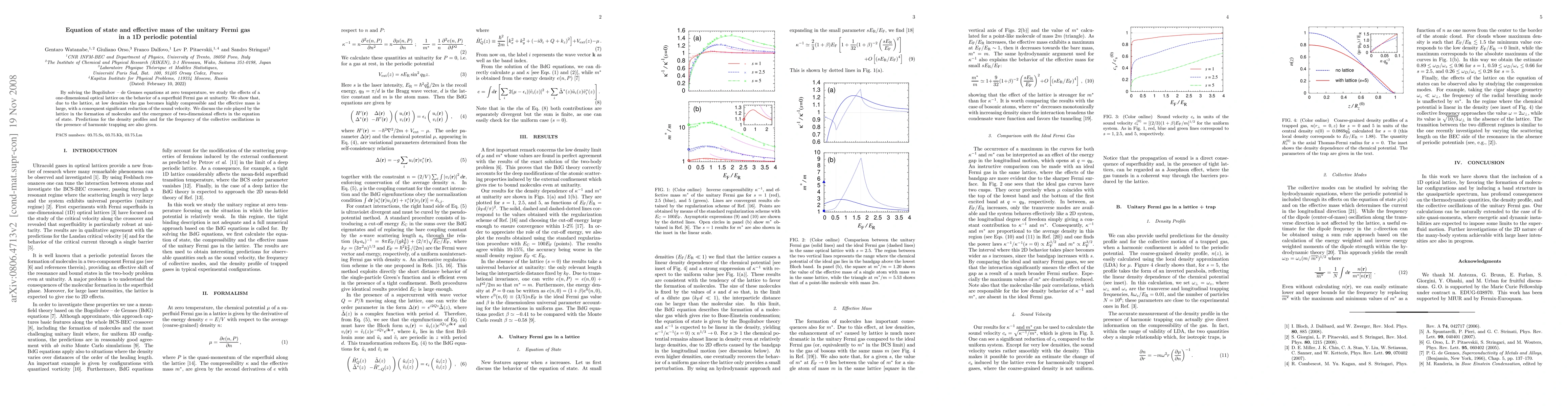 By solving the Bogoliubov -- de Gennes equations at zero temperature, we study the effects of a one-dimensional optical lattice on the behavior of a superfluid Fermi gas at unitarity. We show that, due to the lattice, at low densities the gas becomes highly compressible and the effective mass is large, with a consequent significant reduction of the sound velocity. We discuss the role played by the lattice in the formation of molecules and the emergence of two-dimensional effects in the equation of state. Predictions for the density profiles and for the frequency of the collective oscillations in the presence of harmonic trapping are also given.