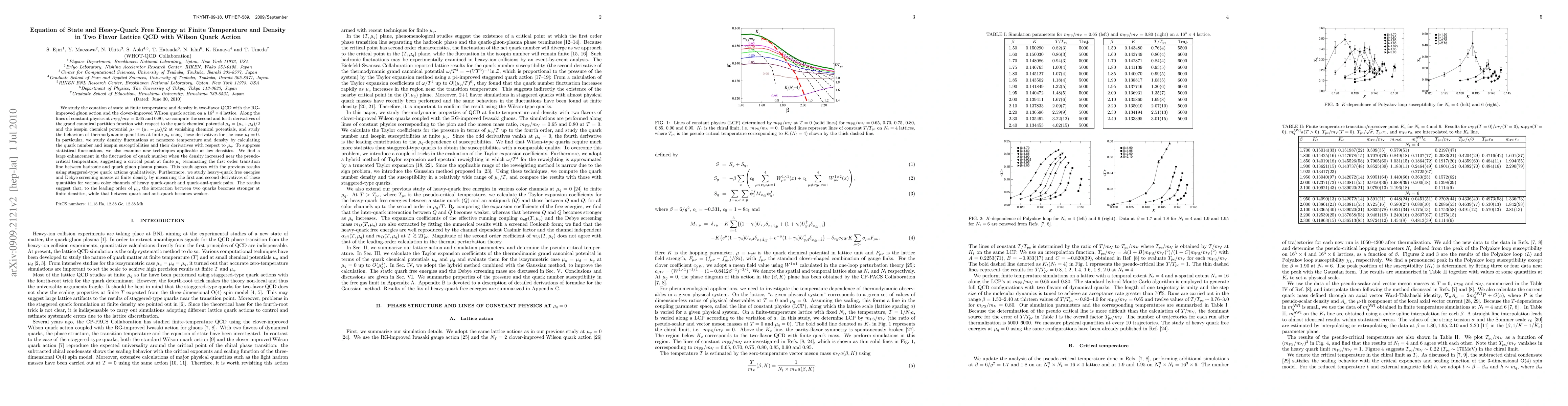 This paper investigates the equation of state and heavy-quark free energy in two-flavor lattice QCD at finite temperature and density, employing RG-improved gluon and clover-improved Wilson quark actions. It finds significant density fluctuations near the pseudo-critical temperature, indicating a critical point terminating the first-order transition line, and observes changes in quark-quark and quark-anti-quark interactions at finite densities.