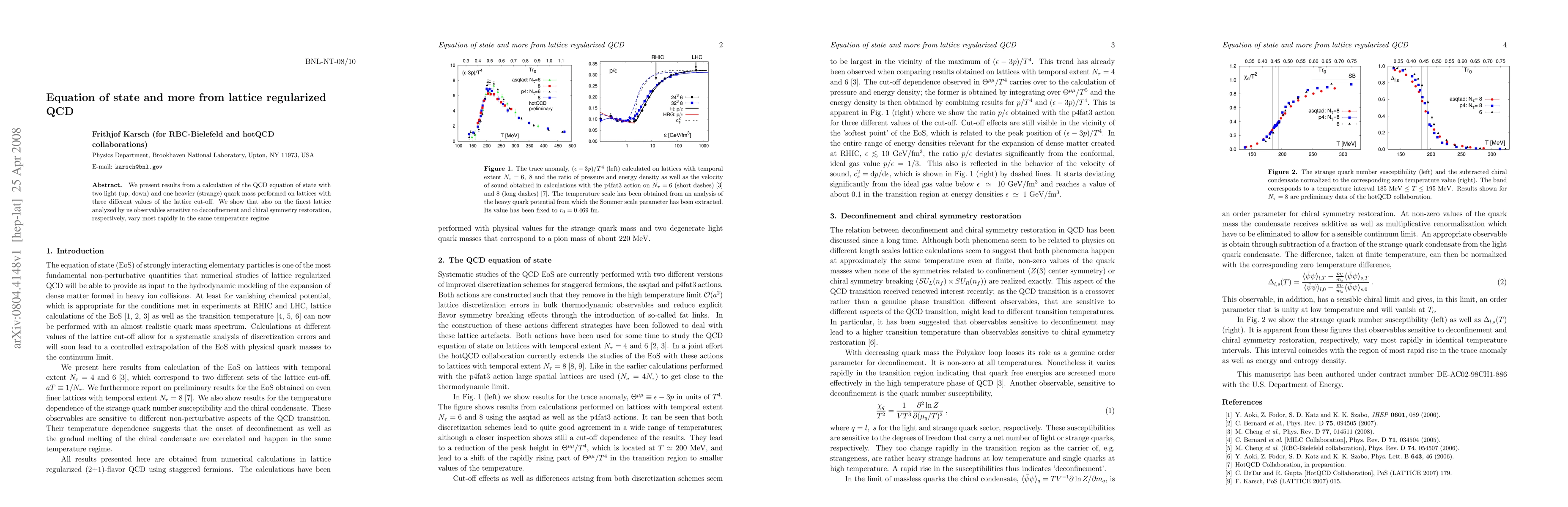 This study investigates the QCD equation of state using lattice QCD with two light and one strange quark, revealing that observables indicating deconfinement and chiral symmetry restoration show significant changes in the same temperature range across different lattice cut-offs.