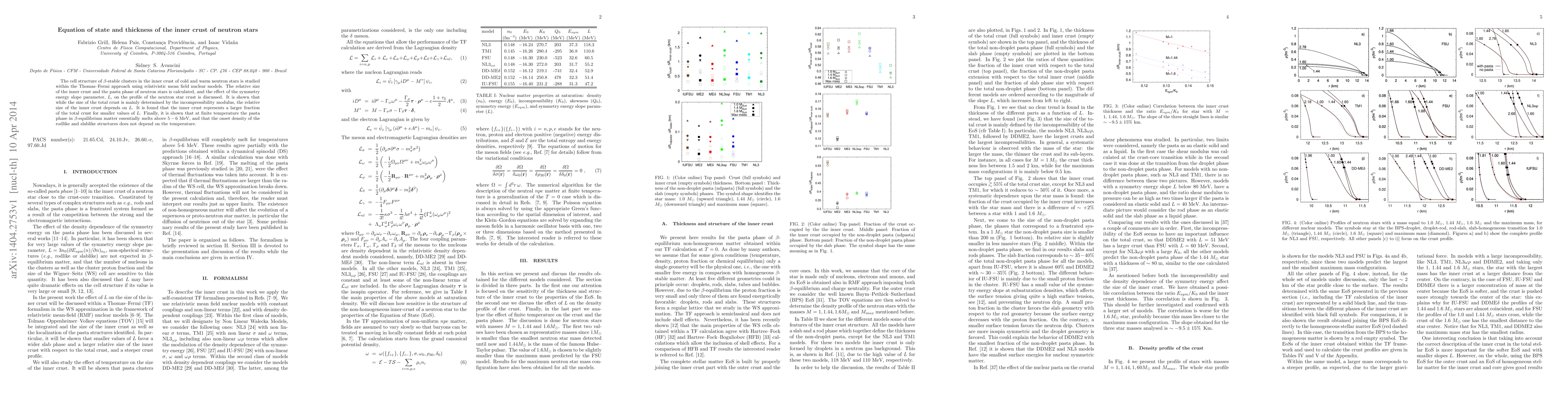 The cell structure of $\beta$-stable clusters in the inner crust of cold and warm neutron stars is studied within the Thomas-Fermi approach using relativistic mean field nuclear models. The relative size of the inner crust and the pasta phase of neutron stars is calculated, and the effect of the symmetry energy slope parameter, $L$, on the profile of the neutron star crust is discussed. It is shown that while the size of the total crust is mainly determined by the incompressibility modulus, the relative size of the inner crust depends on $L$. It is found that the inner crust represents a larger fraction of the total crust for smaller values of $L$. Finally, it is shown that at finite temperature the pasta phase in $\beta$-equilibrium matter essentially melts above $5-6$ MeV, and that the onset density of the rodlike and slablike structures does not depend on the temperature.