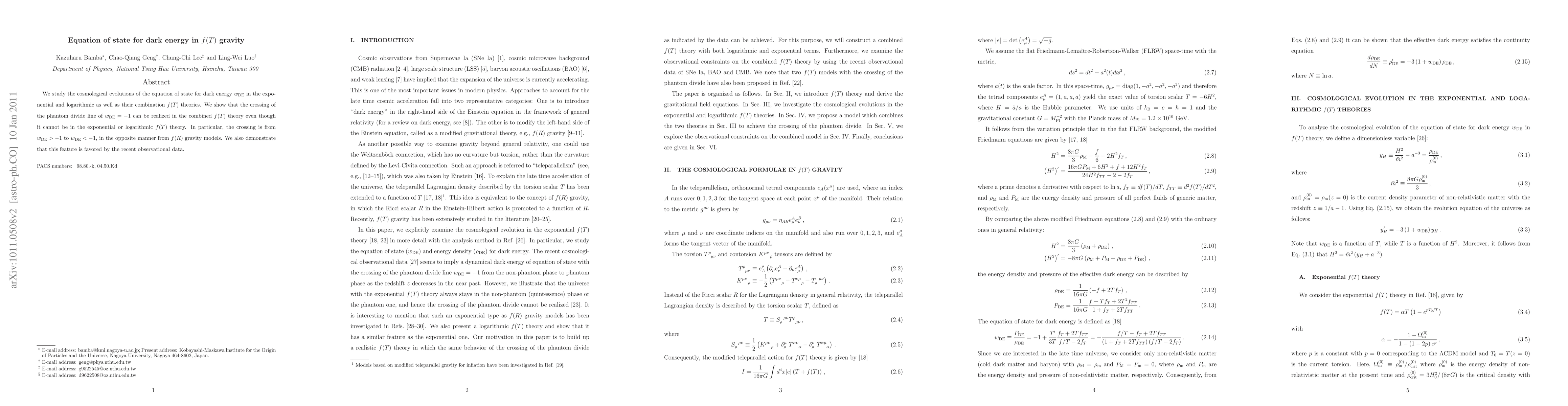 Researchers studied equation of state for dark energy in $f(T)$ gravity theories, finding that a specific combination allows the crossing of the phantom divide line, which is favored by recent observational data.