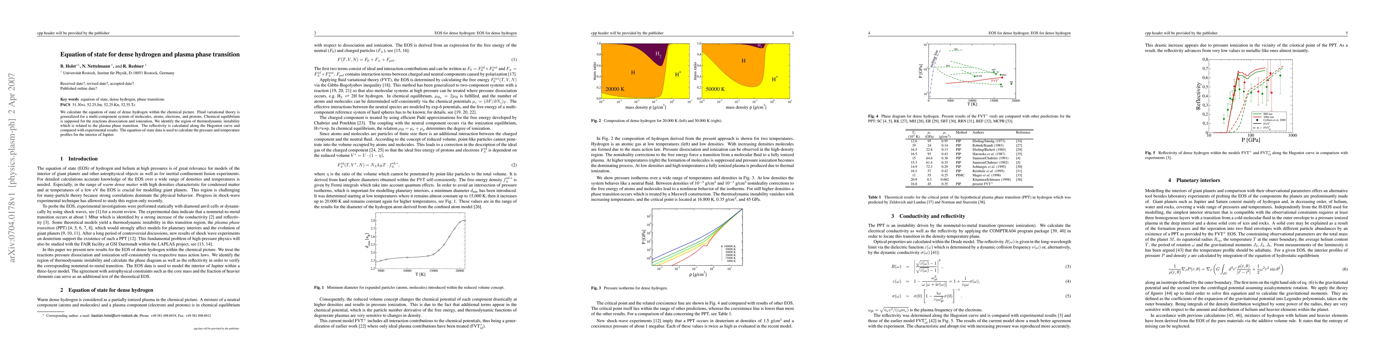 We calculate the equation of state of dense hydrogen within the chemical picture. Fluid variational theory is generalized for a multi-component system of molecules, atoms, electrons, and protons. Chemical equilibrium is supposed for the reactions dissociation and ionization. We identify the region of thermodynamic instability which is related to the plasma phase transition. The reflectivity is calculated along the Hugoniot curve and compared with experimental results. The equation-of-state data is used to calculate the pressure and temperature profiles for the interior of Jupiter.