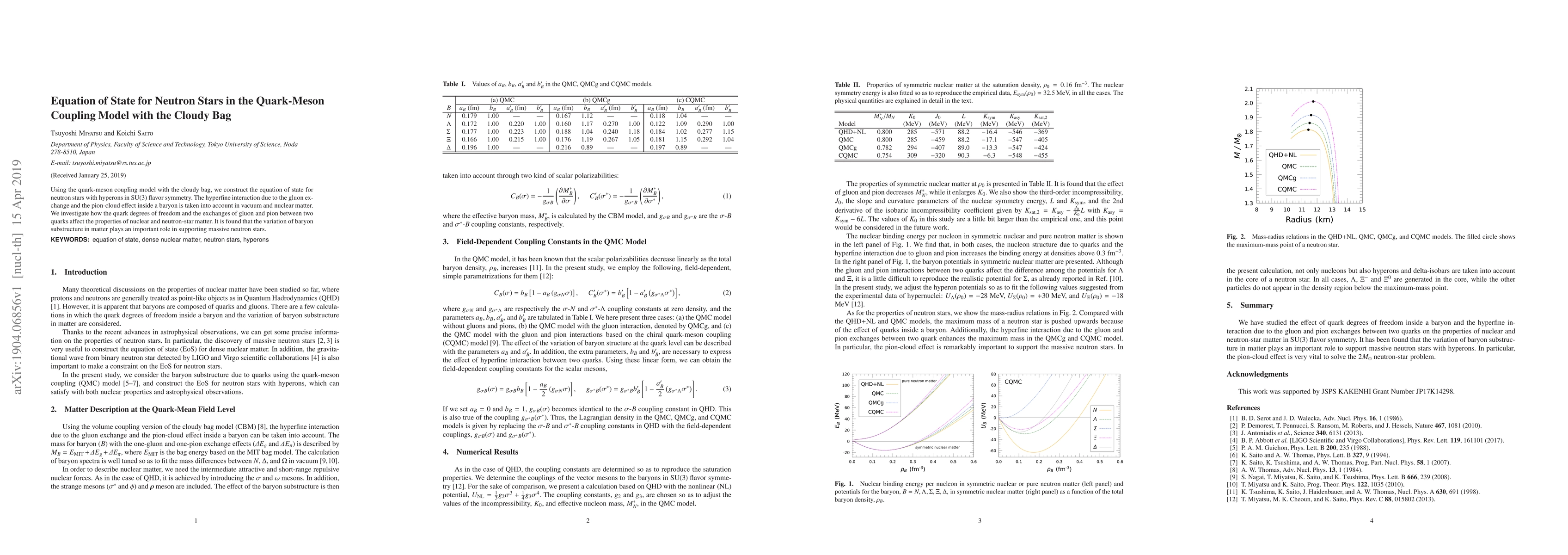 Using the quark-meson coupling model with the cloudy bag, we construct the equation of state for neutron stars with hyperons in SU(3) flavor symmetry. The hyperfine interaction due to the gluon exchange and the pion-cloud effect inside a baryon is taken into account in vacuum and nuclear matter. We investigate how the quark degrees of freedom and the exchanges of gluon and pion between two quarks affect the properties of nuclear and neutron-star matter. It is found that the variation of baryon substructure in matter plays an important role in supporting massive neutron stars.