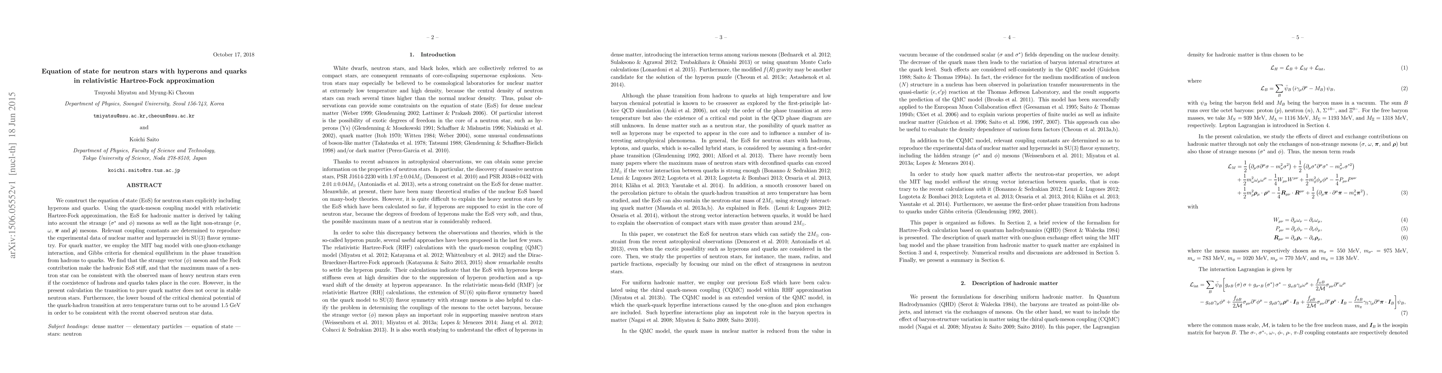 This paper presents an equation of state for neutron stars incorporating hyperons and quarks using the relativistic Hartree-Fock approximation. The study finds that the hadronic equation of state is stiffened by strange vector mesons and Fock contributions, allowing for neutron stars with masses consistent with observations, even with coexisting hadrons and quarks.
