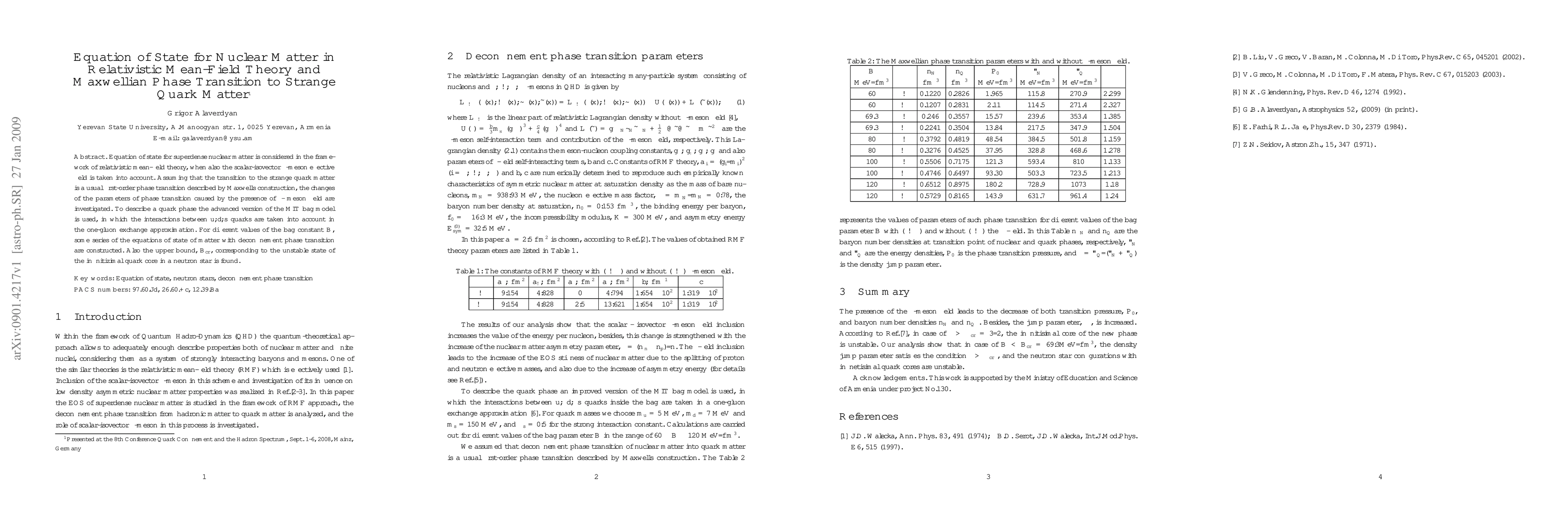 Equation of state for superdense nuclear matter is considered in the framework of relativistic mean-field theory, when the scalar-isovector -meson effective field is taken into account, as well. Assuming that the transition to the strange quark matter is a usual first-order phase transition described by Maxwells construction, the changes of the parameters of phase transition caused by the presence of -meson field are investigated. To describe a quark phase the advanced version of the MIT bag model is used, in which the interactions between quarks are taken into account in the one-gluon exchange approximation. For different values of the bag constant B, some series of the equations of the state of matter with deconfinement phase transition are constructed. Also the upper bound, Bcr, corresponding to the unstable state of the infinitizimal quark core in a neutron star is found.