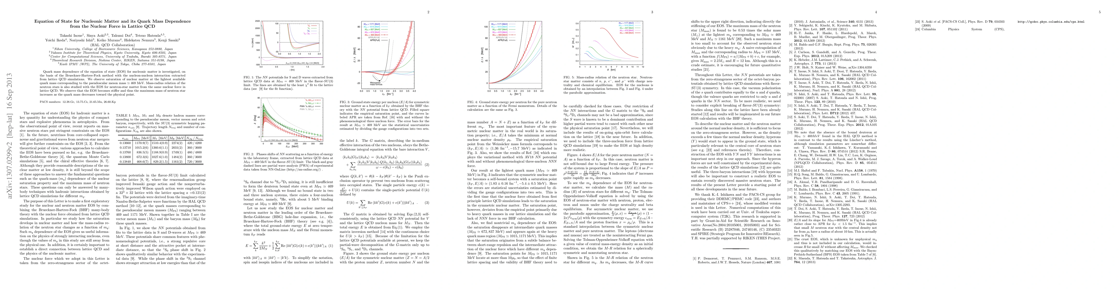 Quark mass dependence of the equation of state (EOS) for nucleonic matter is investigated, on the basis of the Brueckner-Hartree-Fock method with the nucleon-nucleon interaction extracted from lattice QCD simulations. We observe saturation of nuclear matter at the lightest available quark mass corresponding to the pseudoscalar meson mass ~ 469 MeV. Mass-radius relation of the neutron stars is also studied with the EOS for neutron-star matter from the same nuclear force in lattice QCD. We observe that the EOS becomes stiffer and thus the maximum mass of neutron star increases as the quark mass decreases toward the physical point.