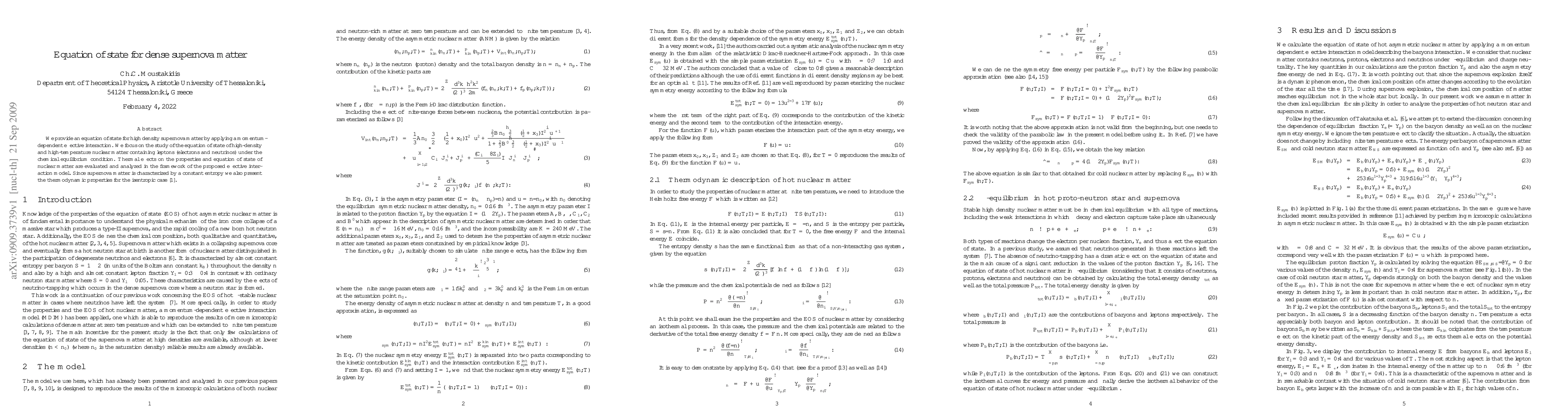 This paper presents an equation of state for high-density supernova matter using a momentum-dependent effective interaction, focusing on the behavior of nuclear matter at high temperatures and densities, including leptons, under chemical equilibrium conditions. It also evaluates thermodynamic properties for the isentropic case.