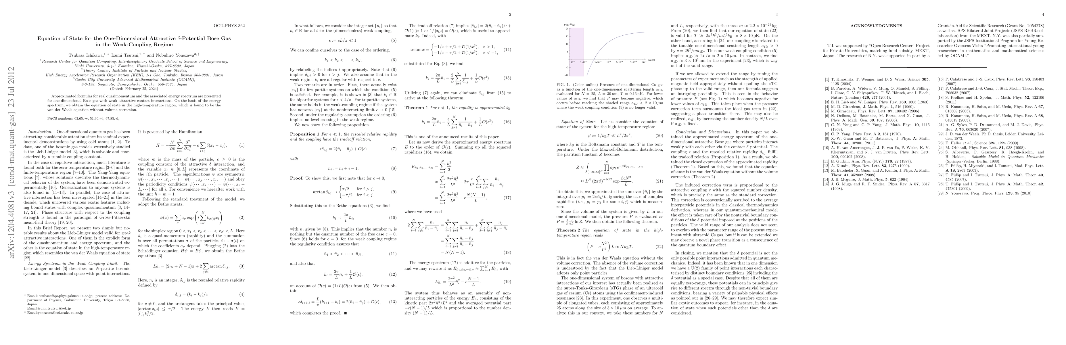 This paper presents approximated formulae for the quasi-momentum and energy spectrum of a one-dimensional Bose gas with weak attractive interactions. The derived equation of state in the high-temperature regime matches the van der Waals equation without volume correction.