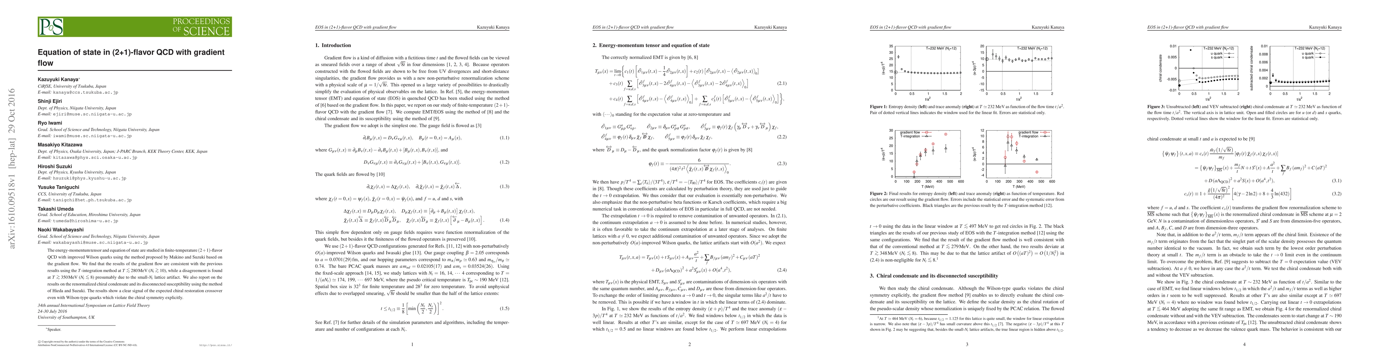 The energy-momentum tensor and equation of state are studied in finite-temperature (2+1)-flavor QCD with improved Wilson quarks using the method proposed by Makino and Suzuki based on the gradient flow. We find that the results of the gradient flow are consistent with the previous results using the $T$-integration method at $T \mathrel{\rlap{\raise 0.511ex \hbox{$<$}}{\lower 0.511ex \hbox{$\sim$}}} 280$ MeV ($N_t\mathrel{\rlap{\raise 0.511ex \hbox{$>$}}{\lower 0.511ex \hbox{$\sim$}}}10$), while a disagreement is found at $T \mathrel{\rlap{\raise 0.511ex \hbox{$>$}}{\lower 0.511ex \hbox{$\sim$}}} 350$ MeV ($N_t \mathrel{\rlap{\raise 0.511ex \hbox{$<$}}{\lower 0.511ex \hbox{$\sim$}}} 8$) presumably due to the small-$N_t$ lattice artifact. We also report on the results on the renormalized chiral condensate and its disconnected susceptibility using the method of Hieda and Suzuki. The results show a clear signal of the expected chiral restoration crossover even with Wilson-type quarks which violate the chiral symmetry explicitly.