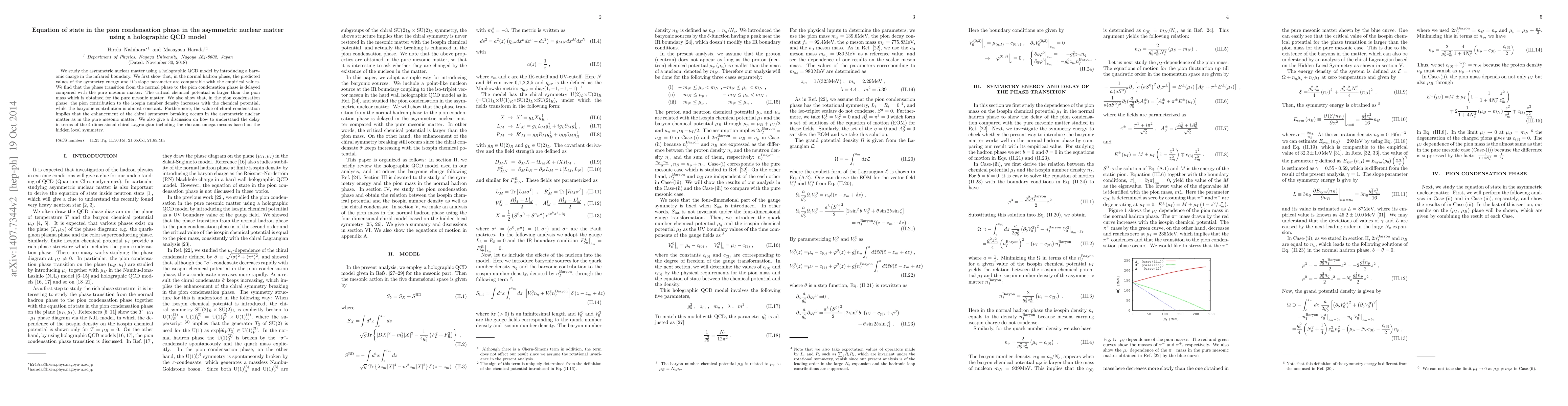 This paper investigates the equation of state in asymmetric nuclear matter using a holographic QCD model, finding that the phase transition to pion condensation is delayed compared to pure mesonic matter. The study also reveals that the pion condensation phase exhibits an increasing pion contribution to isospin density with chemical potential.