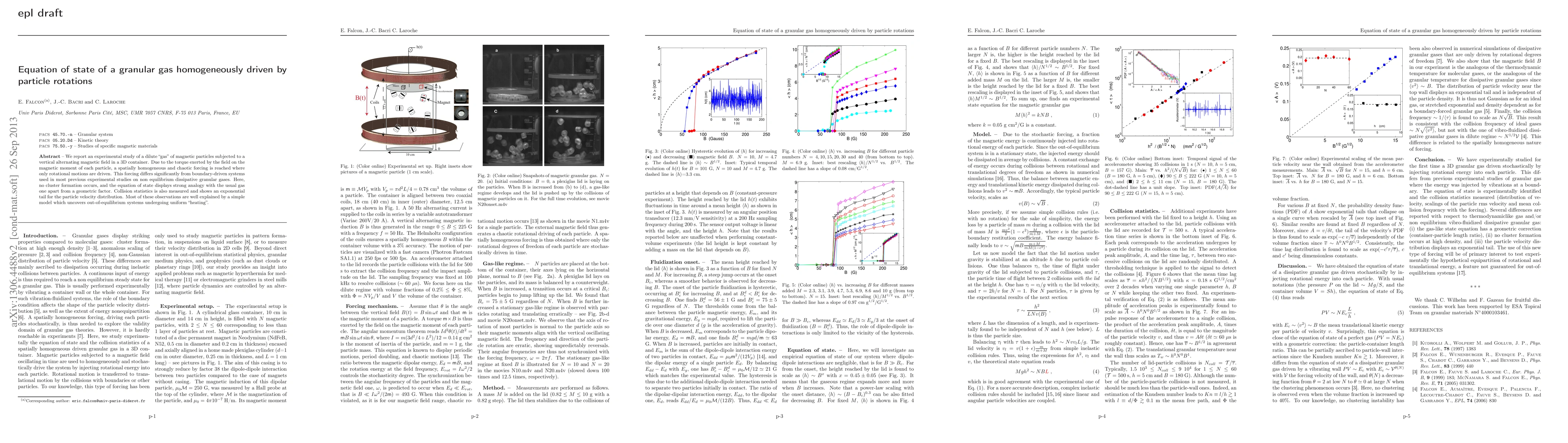 This study experimentally investigates a dilute granular gas of magnetic particles driven by rotational motions via a vertical alternating magnetic field, revealing an equation of state similar to that of a conventional gas with a geometric factor. The system exhibits no cluster formation and an exponential tail in collision statistics, well explained by a model of uniform "heating" in out-of-equilibrium systems.